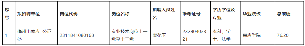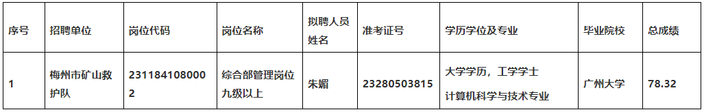 ![]() ![]() 扫码进入备考群/添加客服 刷题打卡/免费学习资料/找公考搭子 23年梅州事编集中招聘拟聘用人员公示汇总 1.梅州市应急管理局直属事业单位梅州市矿山救护队 2.梅州市司法局所属事业单位梅州市嘉应公证处 扫码回复【0304】直接获取公告原文 根据《广东省事业单位公开招聘人员办法》(省政府令第301号)和《梅州市事业单位2023年下半年集中公开招聘高校毕业生公告》规定,经过发布招聘公告、报名、笔试、资格审查、面试、体检、考察等程序,拟聘用朱媚同志为梅州市矿山救护队工作人员(岗位代码2311841080002),现予以公示。 公示期间,如对拟聘人员有异议,请以书面形式向梅州市应急管理局反映。反映情况必须使用真实姓名和联系方式,匿名信函不予受理。 公示时间:自公示发布之日起7个工作日 监督电话:0753-2263817 中共梅州市应急管理局委员会 2024年3月4日 根据《广东省事业单位公开招聘人员办法》(省政府令第301号)和《梅州市事业单位2023年下半年集中公开招聘高校毕业生公告》规定,经过发布招聘公告、报名、笔试、资格审查、面试、体检、考察等程序,拟聘用廖苑玉同志为梅州市嘉应公证处工作人员,现予以公示。 公示期间,如对拟聘人员有异议,请以书面形式向梅州市司法局反映。反映情况必须使用真实姓名和联系方式,匿名信函不予受理。 公示时间:自公示发布之日起7个工作日 监督电话:0753-2308019 梅州市司法局 2024年3月4日 扫码回复【0304】直接获取公告原文 24广东事业单位集中招聘笔试课程 本土专业师资丨华图老师手把手教学 🌟精研事编考情丨知识点有不会立刻问 💪考编拒绝摆烂丨精细把控备考质量 早咨询早上岸丨在职全职都可以备考
