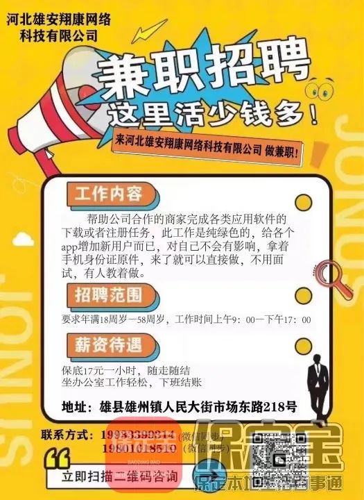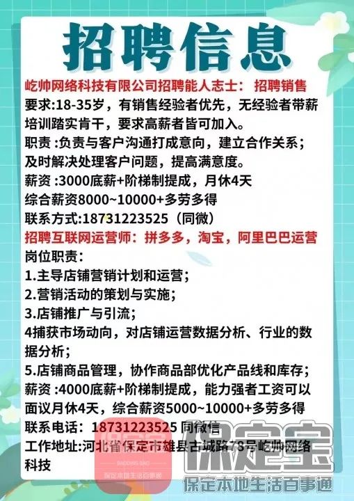 岗位详情:雄县腾远公司招工:招办公室销售:15名工资3500元-1万(女工)年龄18-40岁,每月4天公休每天7.5小时,阿里,淘宝,拼多多后台运营2名车间生产:学徒工—打包工—勤杂工—工资4700元-1万(男工)年龄52岁已下。地址:雄县县城双候大街路西,办公环境整洁,招聘热线:13230289569,15032210501