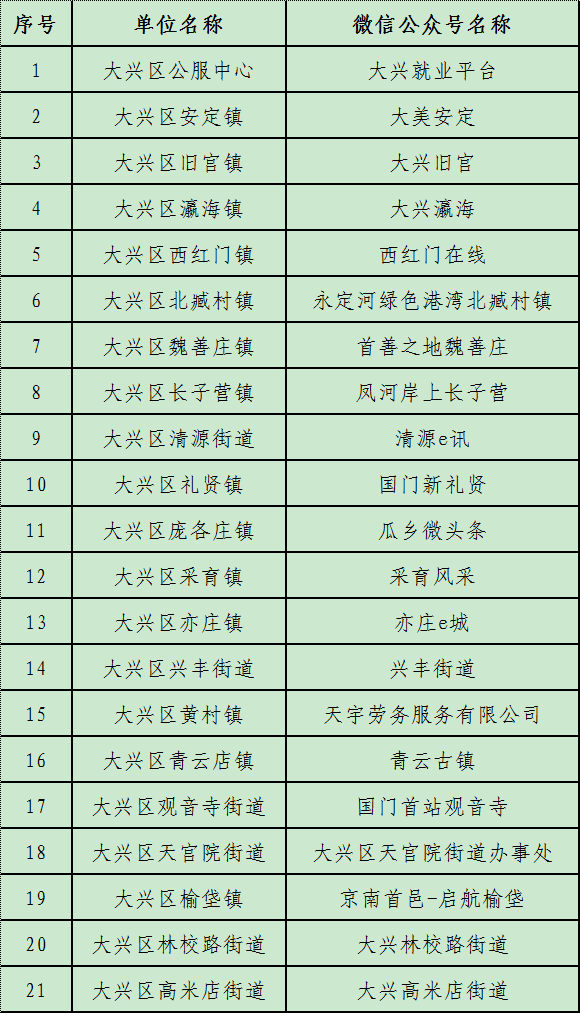 大兴区统筹区、镇两级资源,在属地官方微信、运营管理的微信公众号设置21个“就业专区”,每周宣传发布公共就业服务渠道、招聘会安排、就业岗位、就业政策、就业典型案例等内容,欢迎广大企业及劳动者关注,及时接收最新公共就业服务信息!