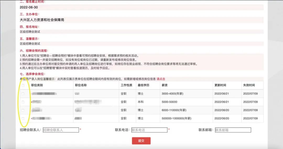 第三步:进入预约界面,勾选要参加岗位后,准确填写联系人、联系电话,点击提交。审核结果可通过“会员中心”-“招聘会预约”-“预约记录”查看。