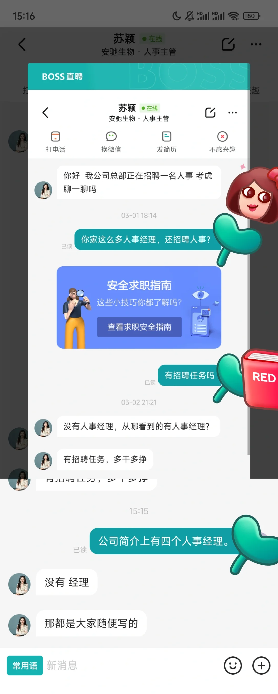 挺无语,想刷刷boss,她给我发消息招聘人事,我点进公司一看,四个人事经理,她是人事主管,一共五个人,还招聘?我就问她了,她居然说瞎写的 你老板知道你这么说吗,公司成员瞎写???他同意吗