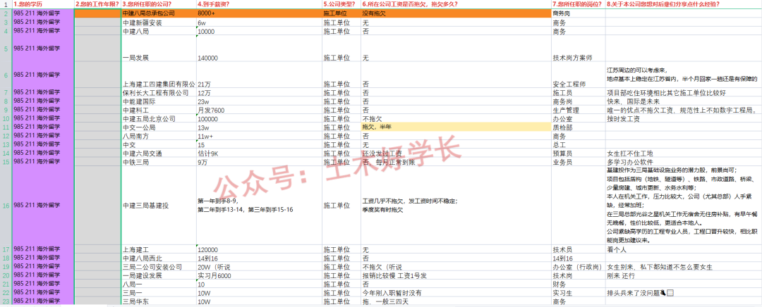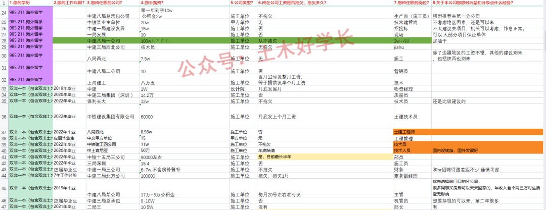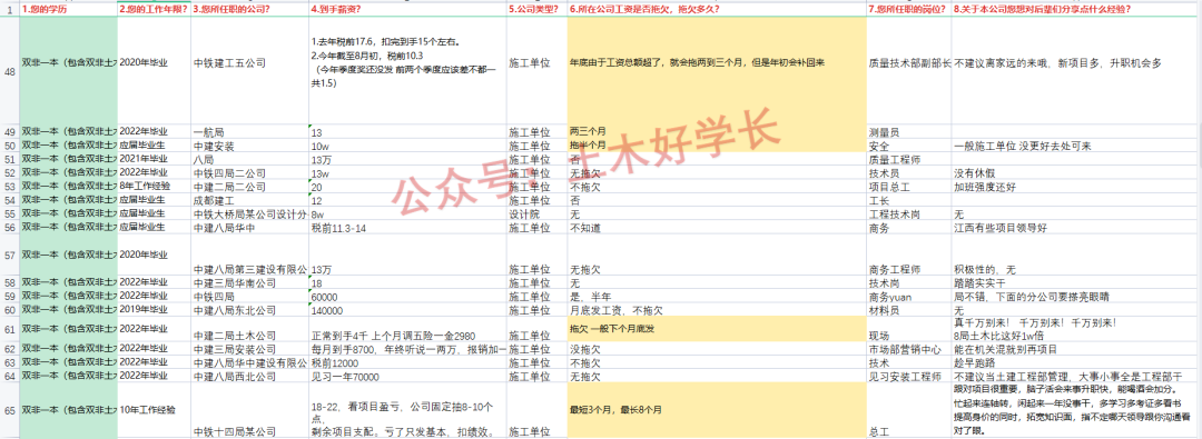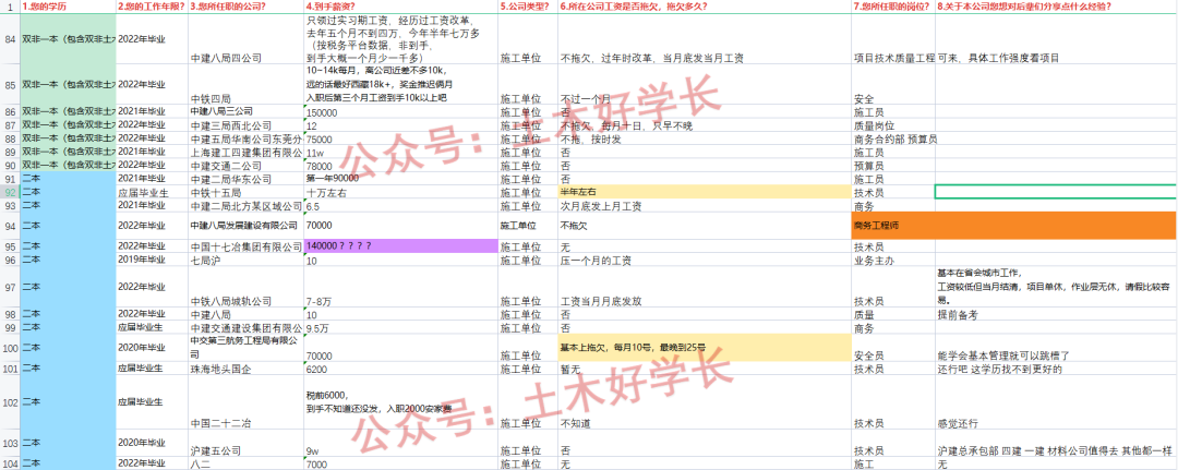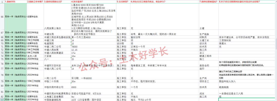 哈喽大家好呀,我是你们朝思暮想的土木好学长,最新一期的工程人公司待遇汇总出来了,今天正好给大家分析分析。本问卷数据来源于公众号的粉丝网友,部分离谱数据真实性本人不做任何保证。以下所有分析主观性较强,仅供大家参考。为防止泄露隐私,部分内容已打码,敬请谅解。参与过分享的可以在后台添加好学长凭借填写素材证明截图免费领取。