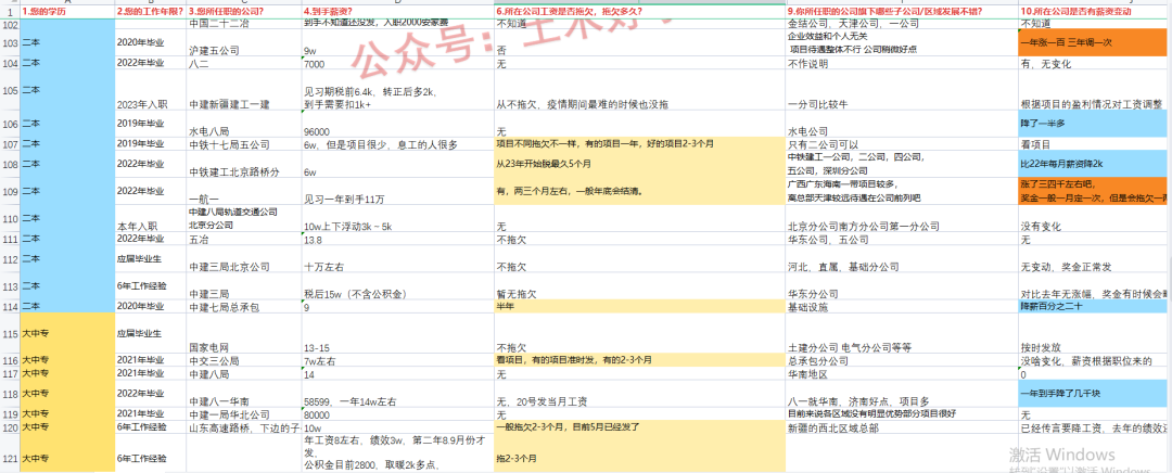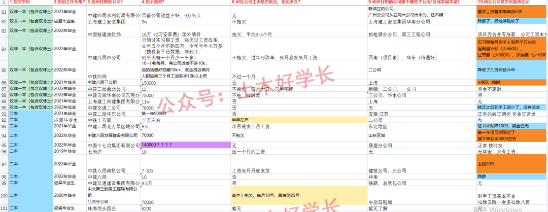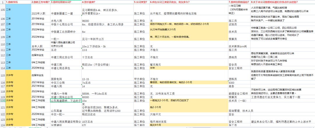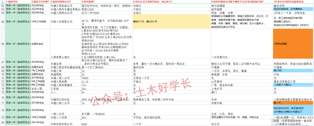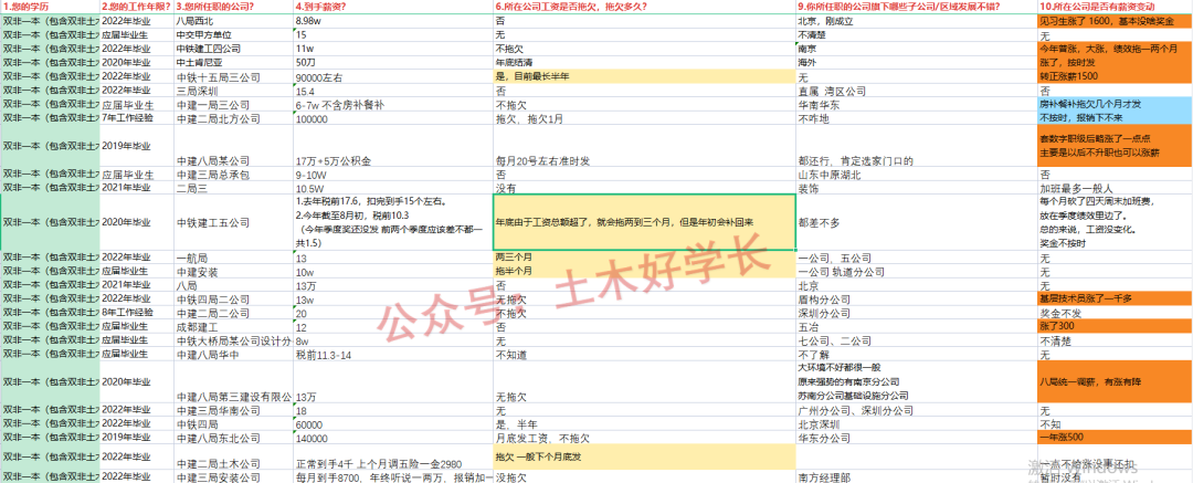 首先感谢提供素材的好学长,本次统计以到手薪资、公司是否欠薪、所在公司内部优秀分公司信息分享、所在公司是否有薪酬变动(涨/降薪)为切入点,为大家介绍一下最新的工程局信息。