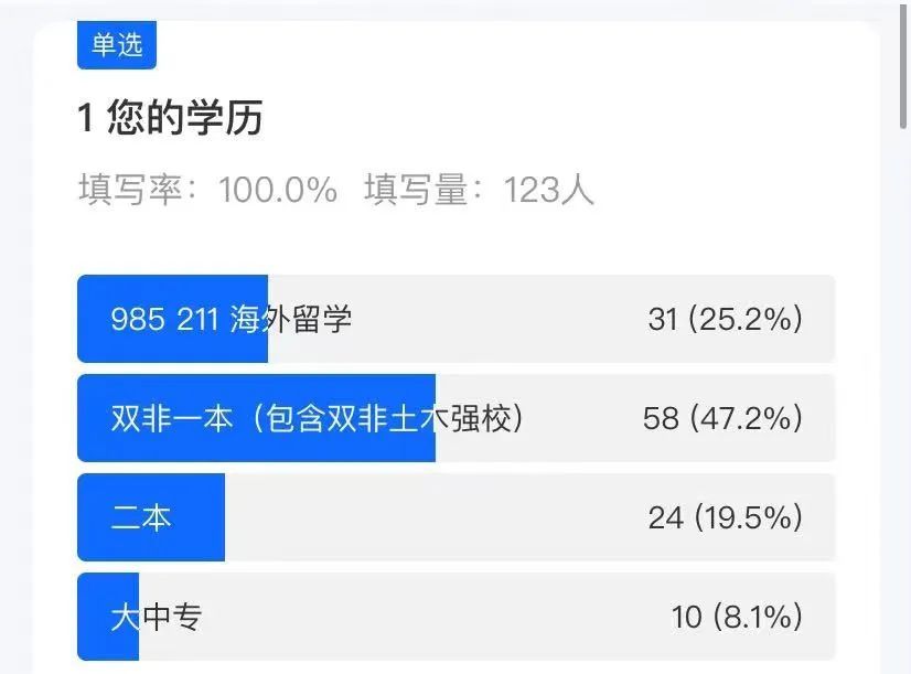 首先问卷中985/211/双一流占了25%的比例,普通一本47%,二本20%,中大专占比8%那么是不是名校就一定更好就业、薪资更高呢?我们一起看一下。