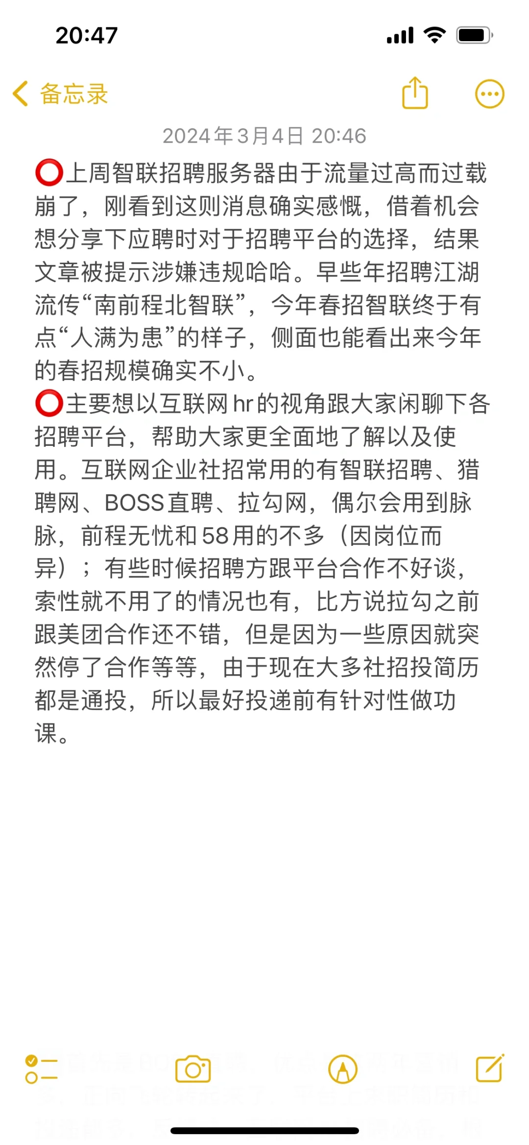 上周智联招聘服务器由于流量过高而过载崩了,刚看到这则消息确实感慨,借着机会想切换视角分享下应聘时对于招聘平台的选择,结果文章被提示涉嫌违规哈哈。早些年招聘江湖流传“南前程北智联”,今年春招智联终于有点“人满为患”的样子,侧面也能看出来今年的春招规模确实不小。