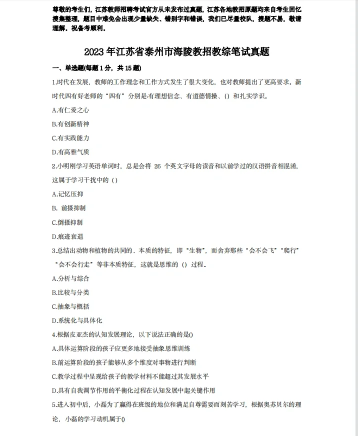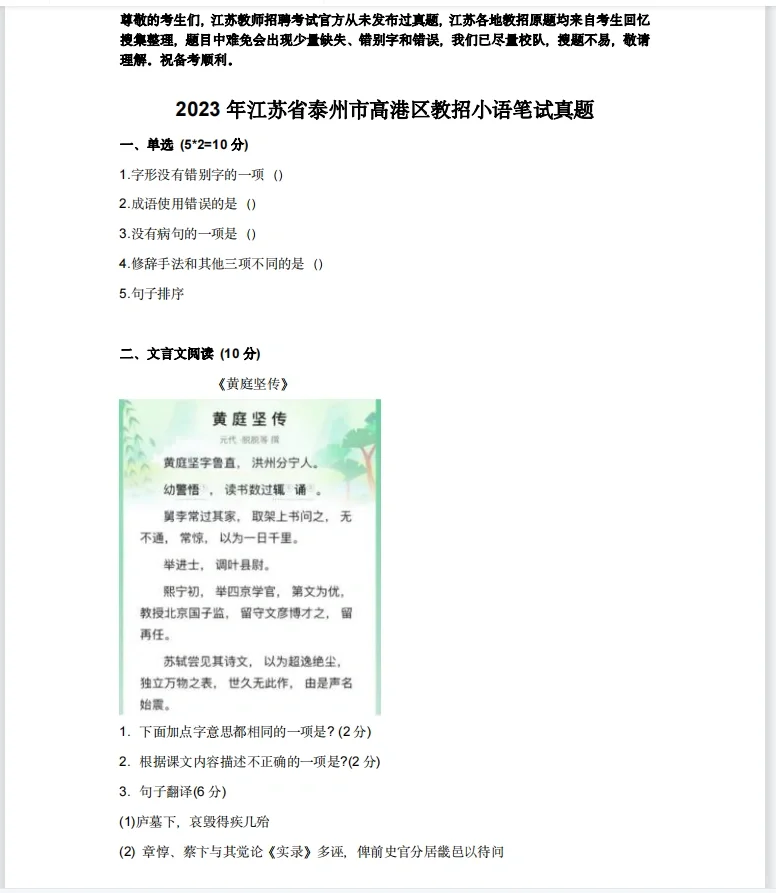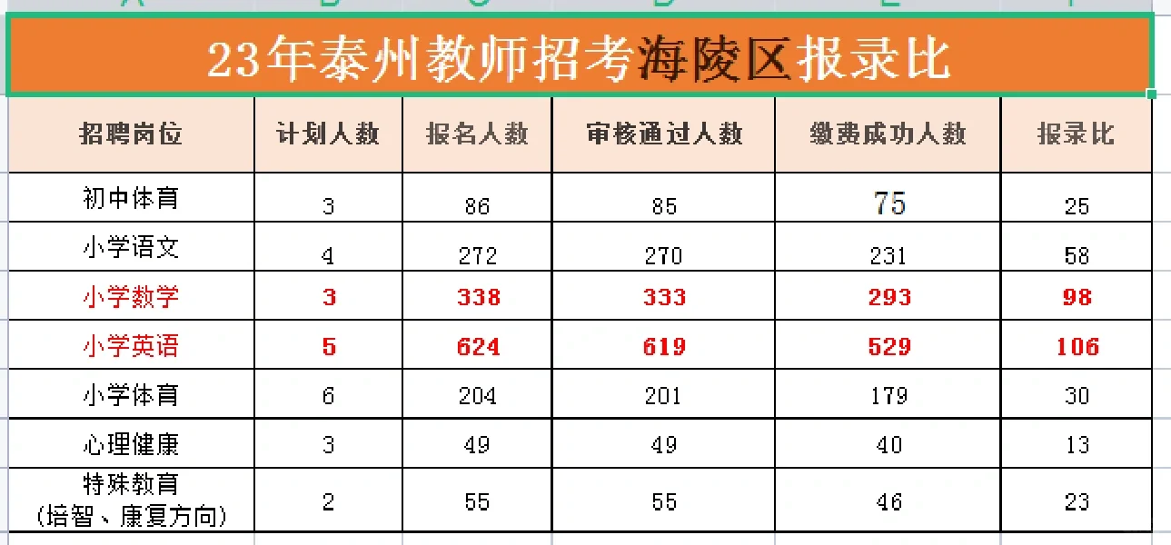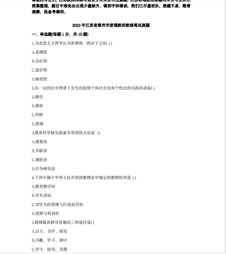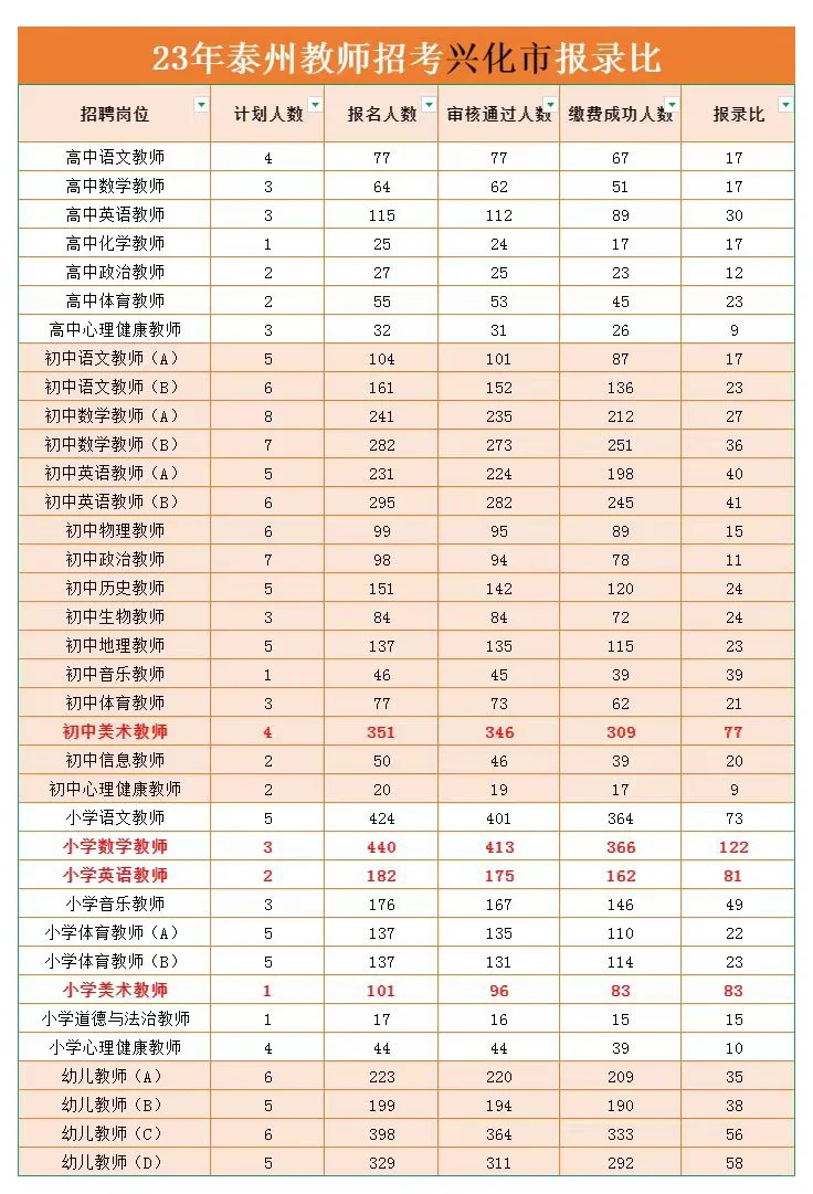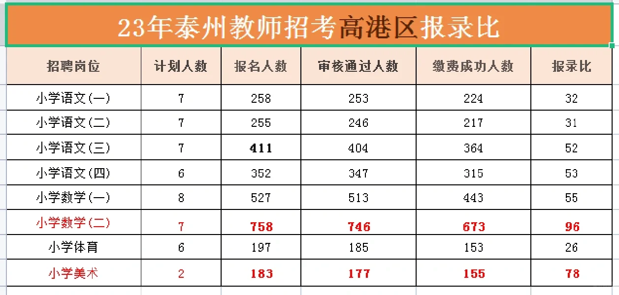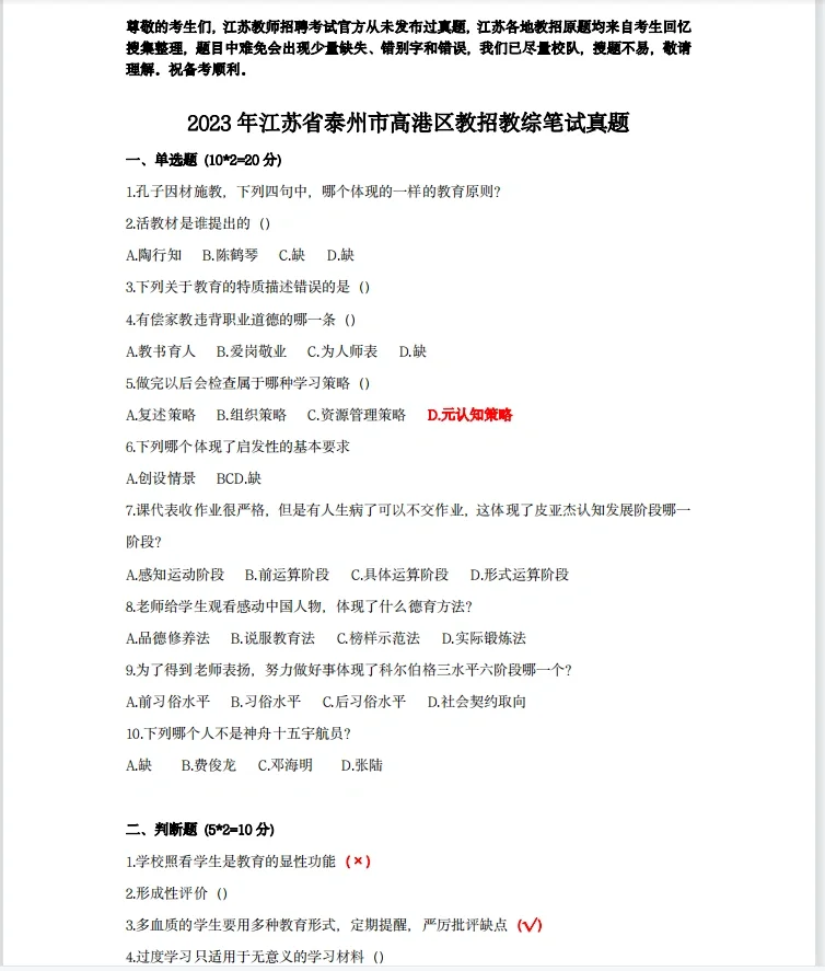 一天,但是各区试卷都不同,一般12月到2月出招聘公告,全域内不限制专业,部分地区不要求学位。23年泰州改革,各区都考30分教综知识加上70分学科专业知识,学科难度偏难,偏高考难度。需要泰州真题的宝子们后台私信老师哦
