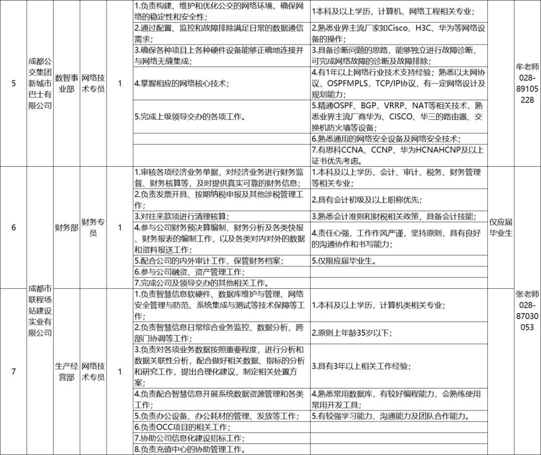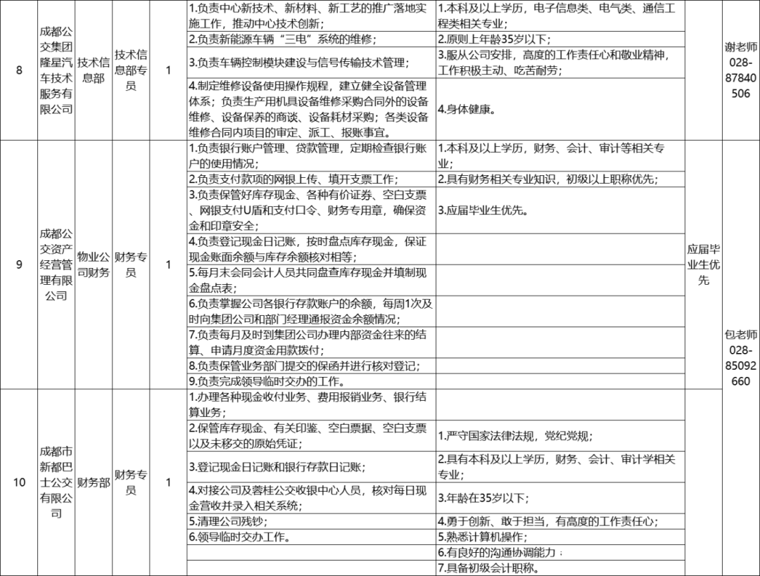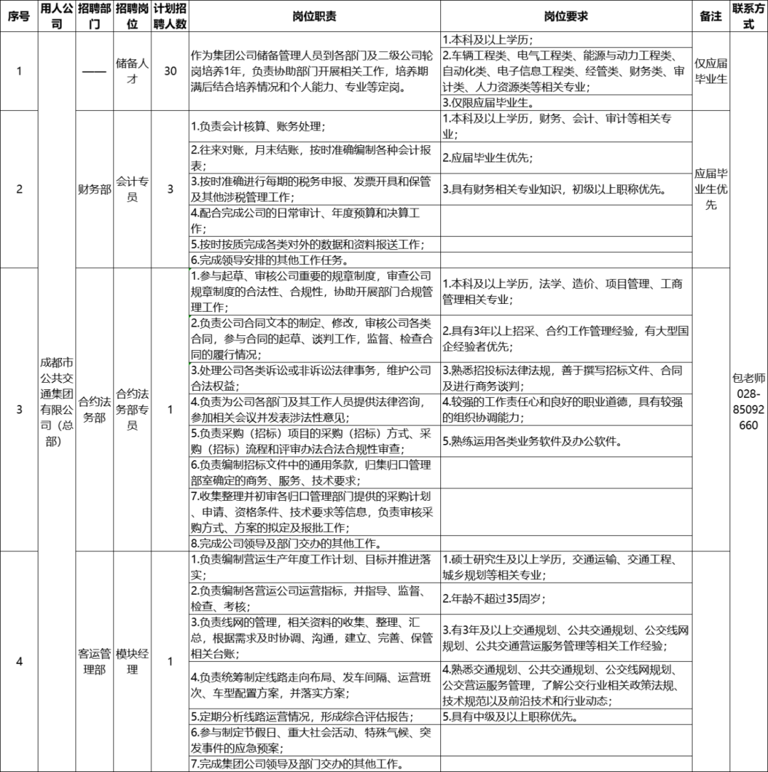 提供完善的福利体系:五险一金、带薪休假、津补贴、健康体检、法定假日、文体活动、生日福利、节日慰问、互助保险、在职培训等。网上报名→筛选入围→组织面试→确定拟录用人员→拟录用通知→体检→签约、办理入职手续以上岗位同时发布在成都公交集团官网、前程无忧、智联招聘网站,您可点击下方链接即可投递简历: