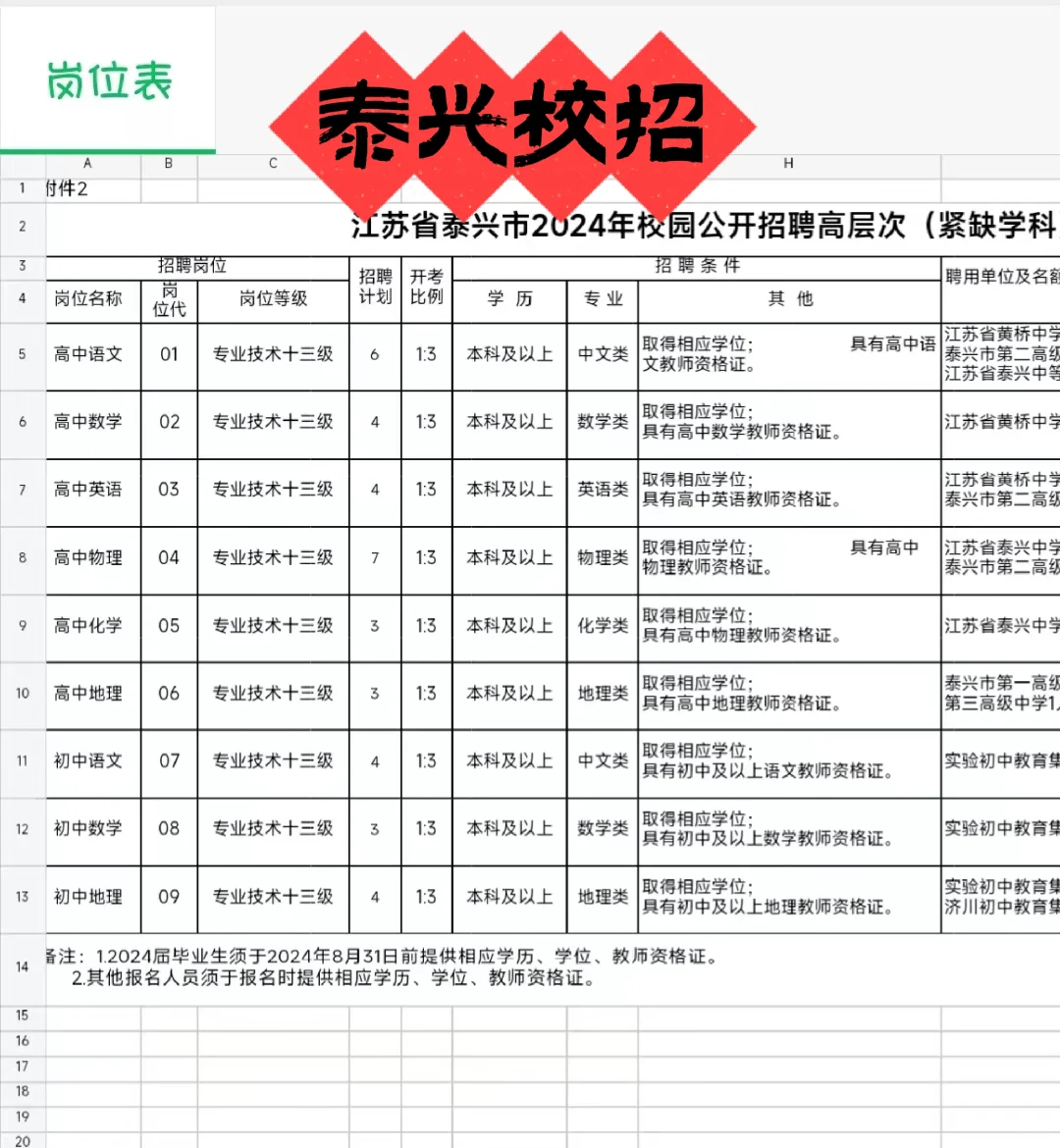 有打算去试试的吗?泰州社招也快开始了吧,泰州去年是全市不限制专业,除了市直和海陵区需要学位,其他地区满足学历和教资就可以报考,要求还是比较低的