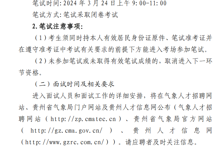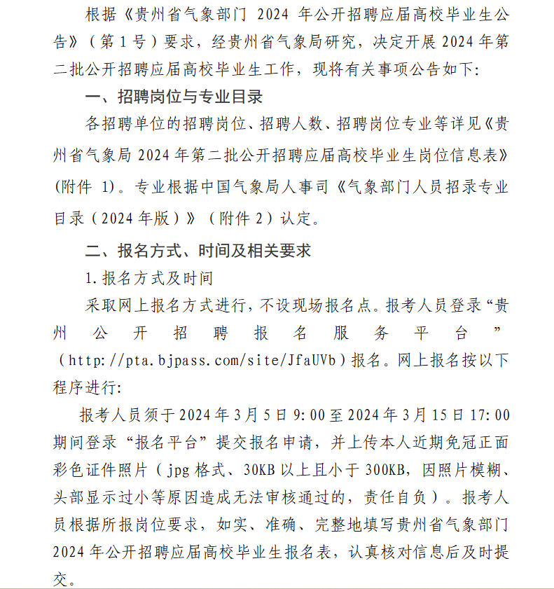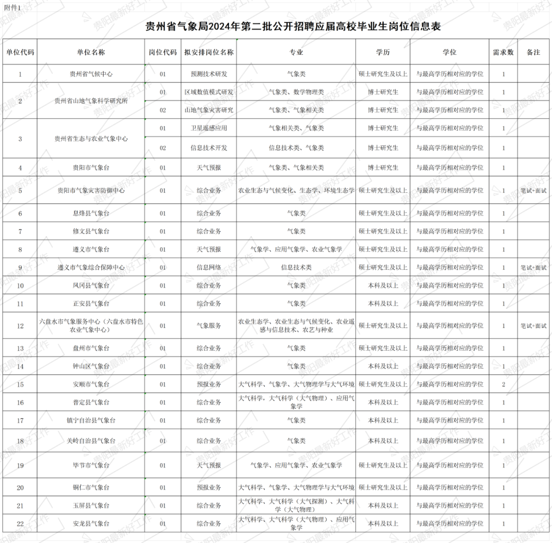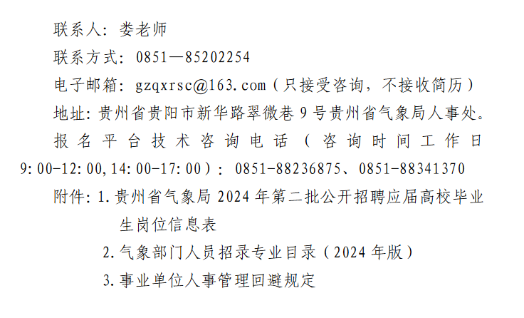点击上方公众号名片关注 查看铜仁最新招聘信息 贵州省气象部门2024年第二批公开招聘26名应届高校毕业生公告 (第4号)文件下载: 贵州省气象部门2024年第二批公开招聘应届高校毕业生公告.pdf 附件1:贵州省气象局2024年第二批公开招聘应届高校毕业生岗位信息表.xlsx 附件2:气象部门人员招录专业目录(2024年版).docx 附件3:事业单位人事管理回避规定.pdf 详情请浏览:http://www.gzrsksw.com/sjzk/2024-03-04/53127.html 温馨提示:我们属于非官方账号,所发信息来自网络,最终解释权归招聘单位,如有疑虑,请查看招聘单位官方渠道信息,如有侵权请联系我们删除。如有疑问,请加微信:gzrsksw8。 |