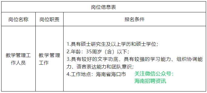 海南大学教务处招聘教学管理工作人员公告 因工作需要,海南新珠江人力资源开发管理有限公司(以下简称新珠江人力)现面向社会公开招聘教学管理工作人员,以劳务派遣方式派遣至海南大学教务处工作,现将相关事项公告如下: 一、招聘岗位与人数 教学管理工作人员1名 二、招聘范围及报名条件 (一)具有中华人民共和国国籍。 (二)遵守中华人民共和国宪法和法律。 (三)具体岗位职责、报名条件要求详见《岗位信息表》 (四)委培、定向或在职人员,须提供原单位同意证明。 (五)有下列情形之一的人员不得报名应聘: 1.尚未解除党纪、政纪处分或正在接受纪律审查的。 2.曾受过各类刑事处罚的。 3.在公务员招录、事业单位公开招聘中违纪违规且处理期限未满的。 4.公务员或事业单位工作人员处于试用期内或未满最低服务年限的。 5.失信被执行人。 6.法律、法规规定的其他不得报考的情形。 三、薪酬待遇 (一)薪酬待遇参照学校相关规定执行。 (二)上班时间按学校安排执行。 四、报名方式 (一)报名方式:采用网络报名方式,请将报名资料打包发至jwc@hainanu.edu.cn,报名邮件主题、附件的文件名均须按“教务处招聘+姓名+毕业学校+学历”的格式命名。 (二)咨询电话:王老师 0898-66259273 (三)报名时间:2024年3月5日至2024年3月11日12:00,逾期不再接受报名。 (四)应聘者本人须准备以下资料报名: 1.个人简历(填写附件1); 2.报名信息表(填写附件2); 3.身份证扫描件一份; 4.毕业证书及其他学历证明扫描件一份; 5.职称证书、资格证书或其他资格审查佐证资料扫描件一份(如有); 6.近期1寸免冠彩照电子正面相片1张; (五)应聘者应如实反映本人情况,所提供的材料必须真实有效,如有弄虚作假,执伪造证件、证明、档案及其它材料获得面试或聘用资格的,一经发现,一律取消报名和聘用资格; (六)资格不符者等谢绝报名。 (七)报名有效期限内同一应聘人员发送多封邮件的,将默认最后一封的邮件有效。 五、用工形式 本次招聘的为劳务派遣制员工,劳动合同与海南新珠江人力资源开发管理有限公司签订2年的劳动合同工,试用期2个月。 六、招聘形式及注意事项 (一)简历筛选:对报名人员进行简历筛选,经审查符合条件者择优组织考核。 (二)考核方式:待定 (三)考核时间、地点另行通知。 (四)为了保证招聘工作有条不紊地进行,招聘全程在“海南新珠江人力”微信公众号公布。若因考生未能关注指定公告信息,造成不能按时到指定考点参加考核、或未在指定官网而在其它网站下载错误信息造成的后果,由考生自负。 ![]() |
