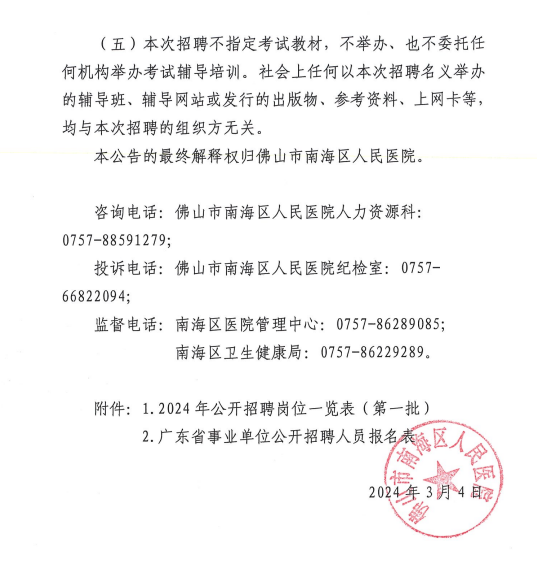 本次招聘按照事业单位公开招聘方式进行,通过医院官网发布招聘公告,同时委托中共佛山市南海区委组织部网站发布招聘信息。本次招聘岗位共18个,共招聘19人,具体招聘岗位见职位表:2024年公开招聘岗位一览表。