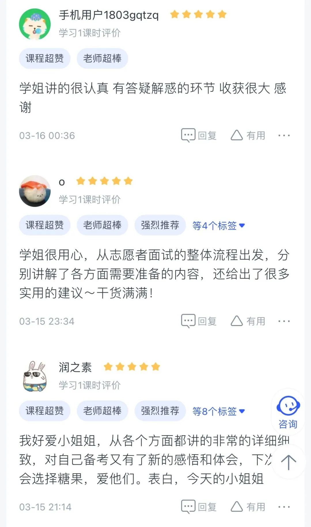 2、1v1全真模拟面试,邀请985、211名校在岗志愿者学姐为你精准点评,让你看到自己肉眼可见的蜕变!