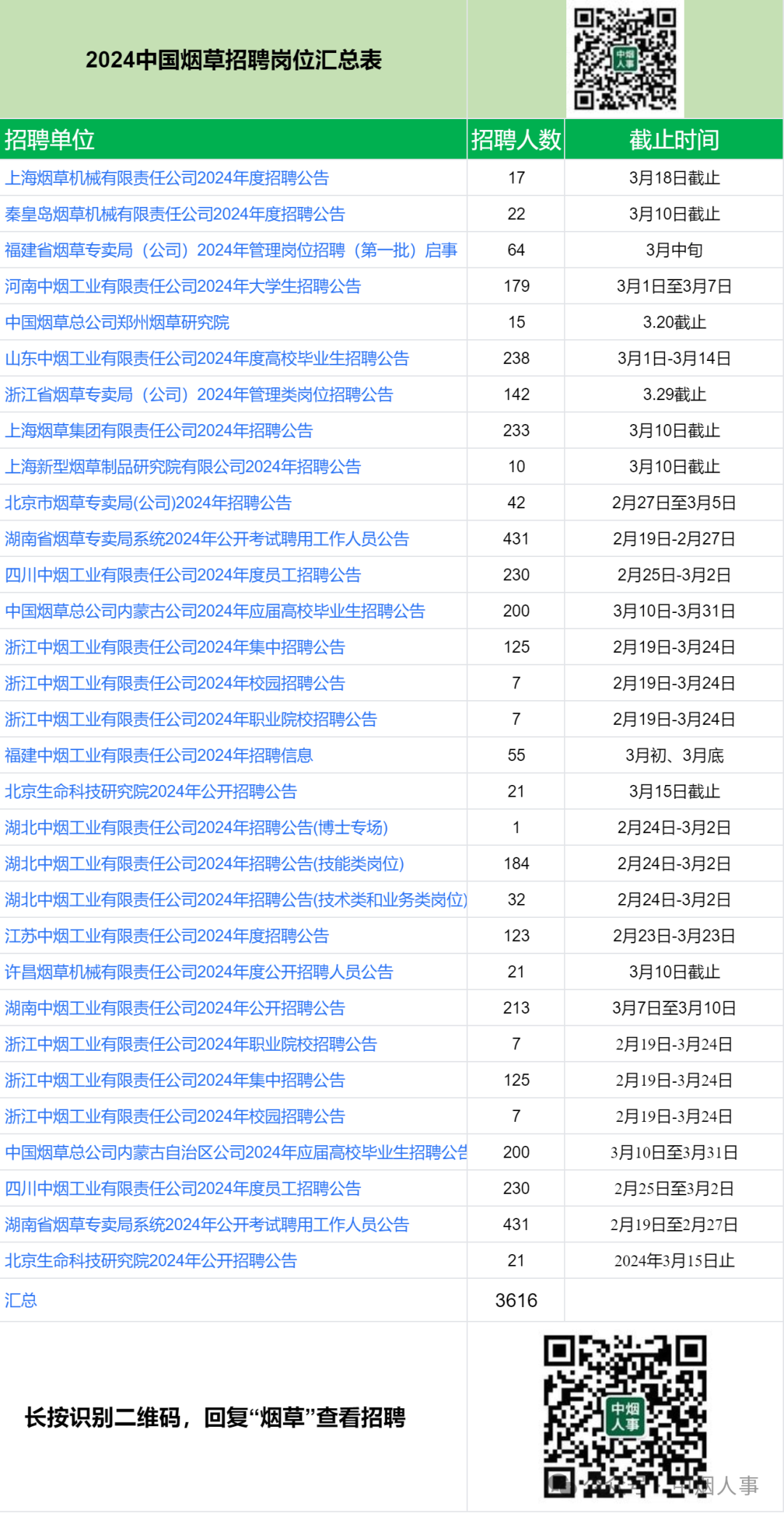 更多近期烟草招聘:正式编制!中国烟草公司2024年招聘开始啦!
