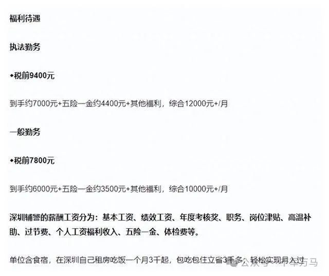 据了解,深圳辅警的月薪约为7500元,年底可能会获得13薪的奖励,额外约2700元左右。这意味着,考虑到年终奖,深圳辅警的年收入大约在10万元左右。虽然对许多人来说,这个数目可能不算高,但对于一个非正式编制的岗位来说,这已经是相对可观的薪酬水平了。而且,辅警的总收入并非仅由基本工资构成,还包括公积金、社保等福利内容。