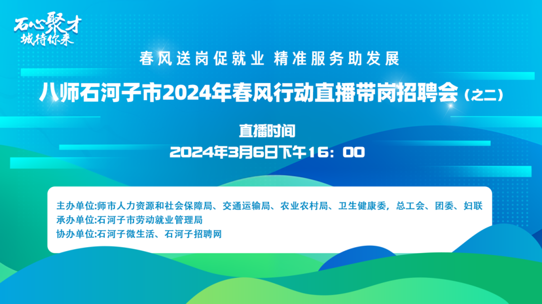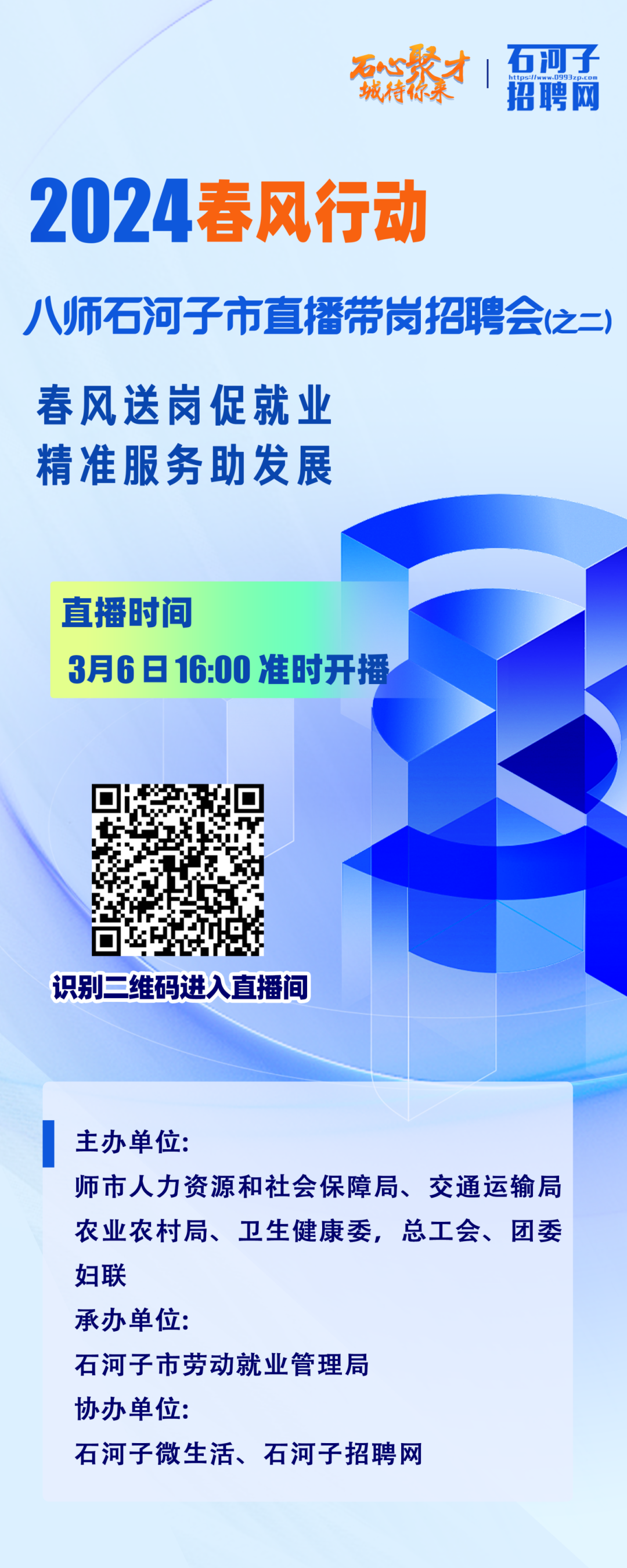为做好春节前后劳动者换岗流动高峰期和企业复工复产关键期就业工作,全力稳就业、保用工、促发展,师市人社局、交通运输局、农业农村局、卫生健康委,总工会、团委、妇联定于2024年春节后开展八师石河子市2024年春风行动直播带岗招聘会。