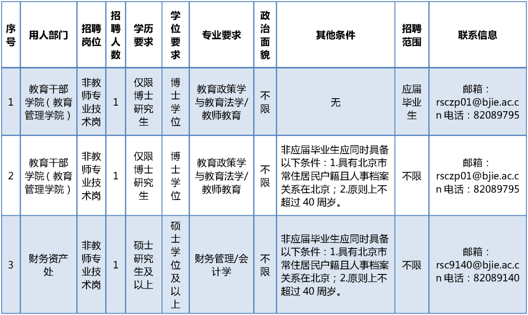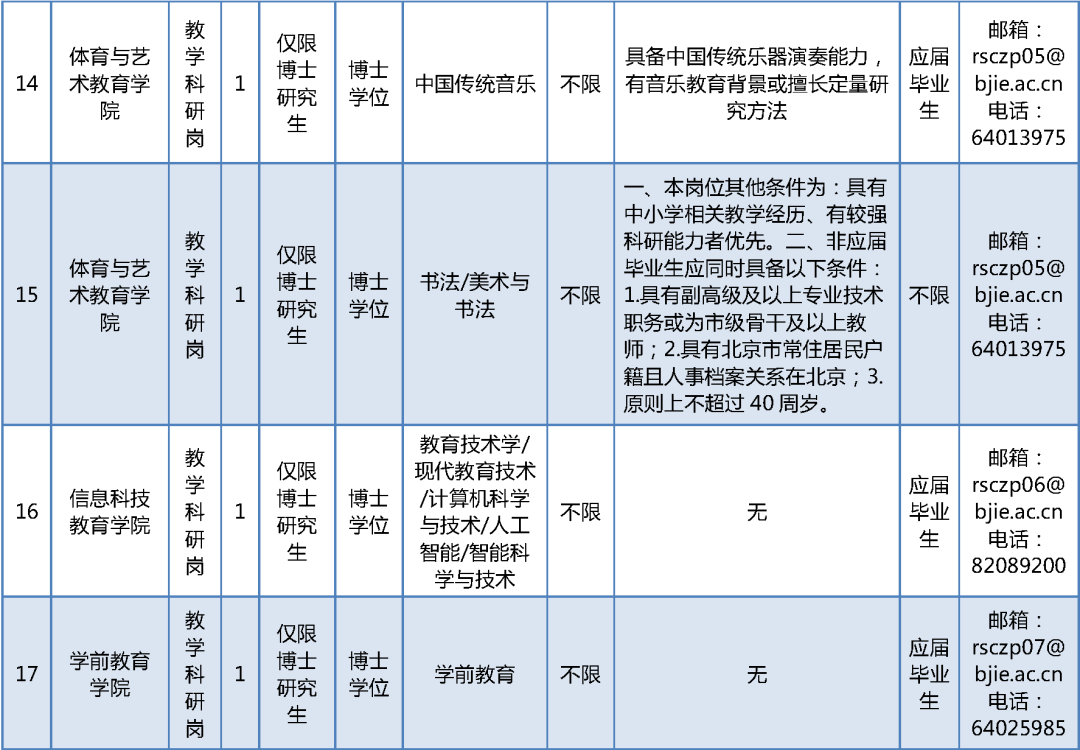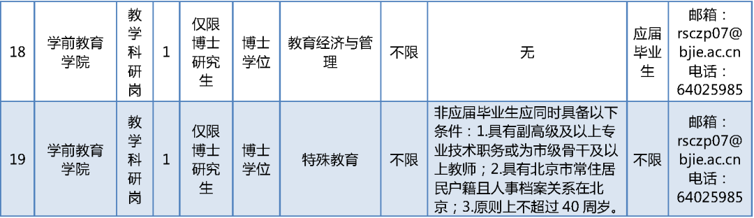 本次计划招聘19名专任教师岗位人员,3名其他专业技术岗位人员,4名管理岗位人员。岗位具体要求详见《北京教育学院 2024年公开招聘岗位需求表》⬇⬇⬇