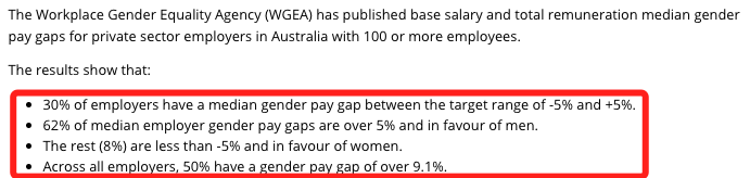 The Workplace Gender Equality Agency(工作场所性别平等机构)表示👇,2022/23年的总薪酬中位数差距为19%,男性占优势,基本工资中位数差距为14.5%,平均总工资差距为21.7%。