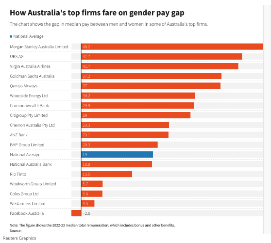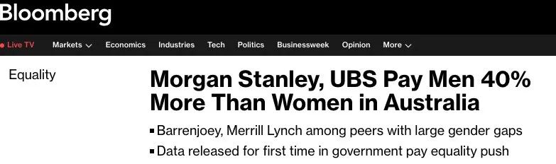 据Bloomberg报道👇,根据澳大利亚政府在26日首次发布的公司层面数据,Morgan Stanley和UBS在澳大利亚的业务中,男性员工的平均薪酬比女性员工高出40%以上。