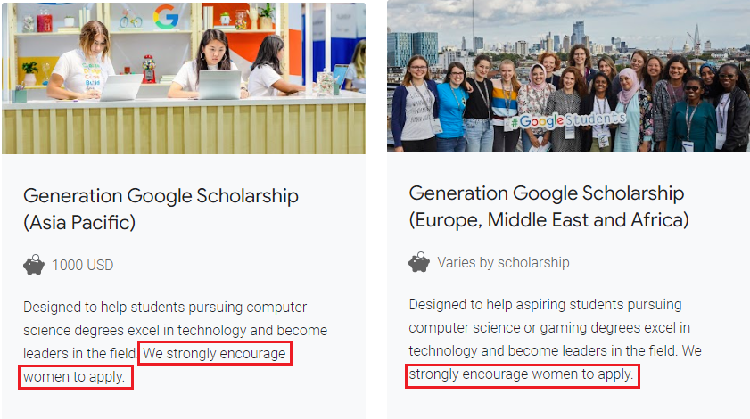Bain在先前还开放了CREW项目,旨为让北美本科二年级女性申请!Google更直接,在开放的各类奖学金中狂打直球:我们强烈鼓励女性来申请!*图片来源:Google