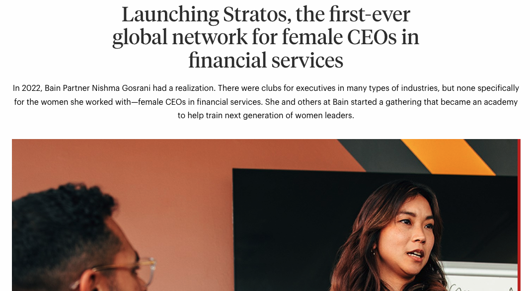 Bain和合伙人共同推出Stratos项目——首个针对金融服务领域女性首席执行官的全球网络,帮助培养下一代女性领导人!