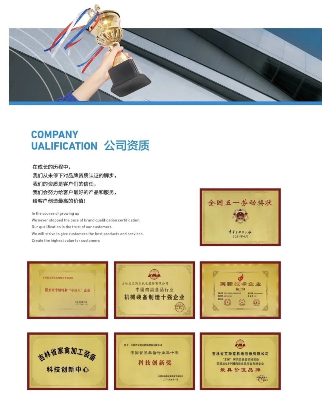 吉林省艾斯克机电有限责任公司是国内智能化家禽屠宰及深加工成套装备研发、制造的生产商和服务商。公司被认定为高新技术企业、国家专精特新“小巨人”企业、中国肉类加工设备十强企业,为家禽加工装备及加工工艺标准起草单位。多年来以“坚持科技创新,创一流企业,树百年品牌”为宗旨,致力于研发、制造高端家禽加工装备,推进国家智能化家禽屠宰及深加工成套装备的优化升级。