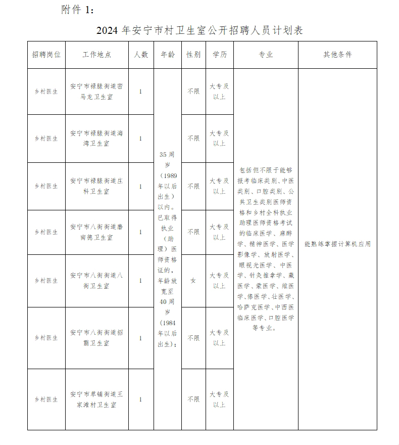 安宁市下属3家卫生院共公开招聘乡村医生7名。具体招聘岗位及招聘条件,详见《2024年安宁市村卫生室公开招聘人员计划表》(后简称:《岗位计划表》)(附件1)。