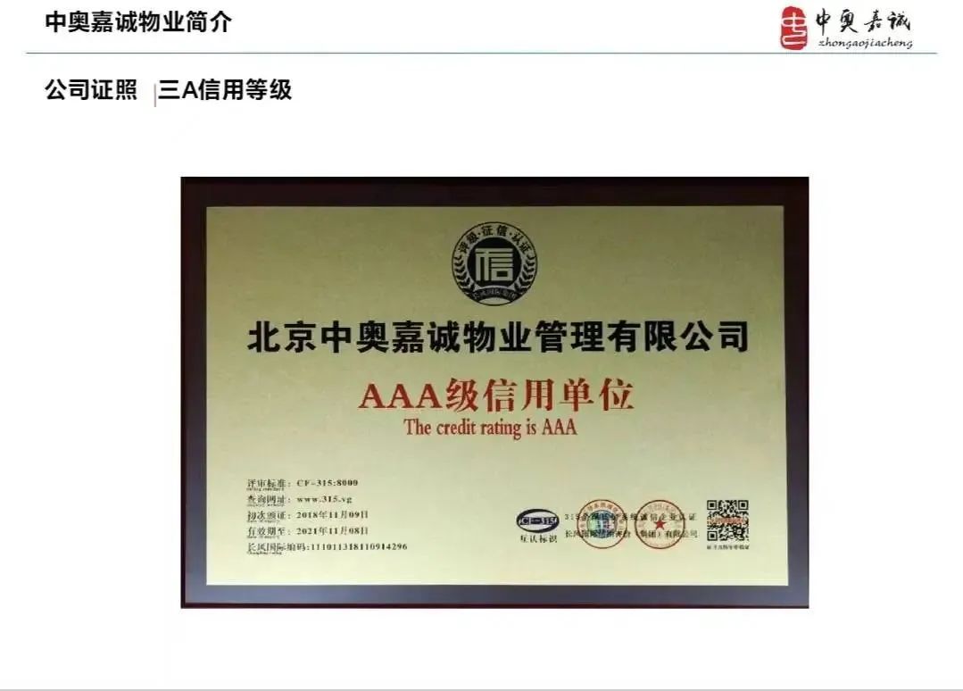 北京中奥嘉诚物业管理公司,成立于2002年7月5日,具有独立法人资格和物业管理三级资质的专业物业管理服务公司;公司注册资金5000万元人民币,现为北京市物业管理行业协会理事单位,顺义区物业管理规范化服务优秀集体。