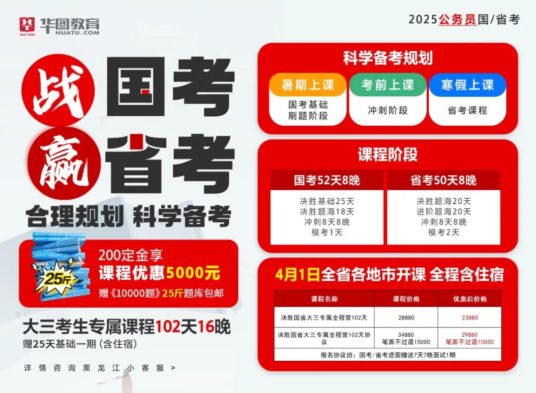 2025公务员国/省考大三考生专属课程102天16晚200定金享优惠5000元4月1日全省各地市开课 全程含住宿详情咨询黑龙江小客服