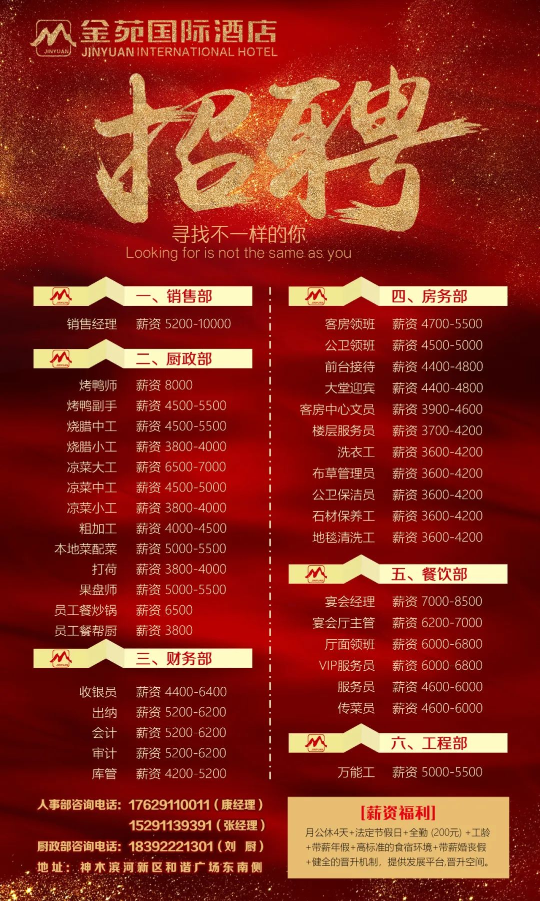 陕西省神木市【金苑国际酒店】招募有才华、有梦想的您!我们酒店正在招聘多个职位,提供良好的工作环境和发展空间。和我们一起奋斗,共同成长!