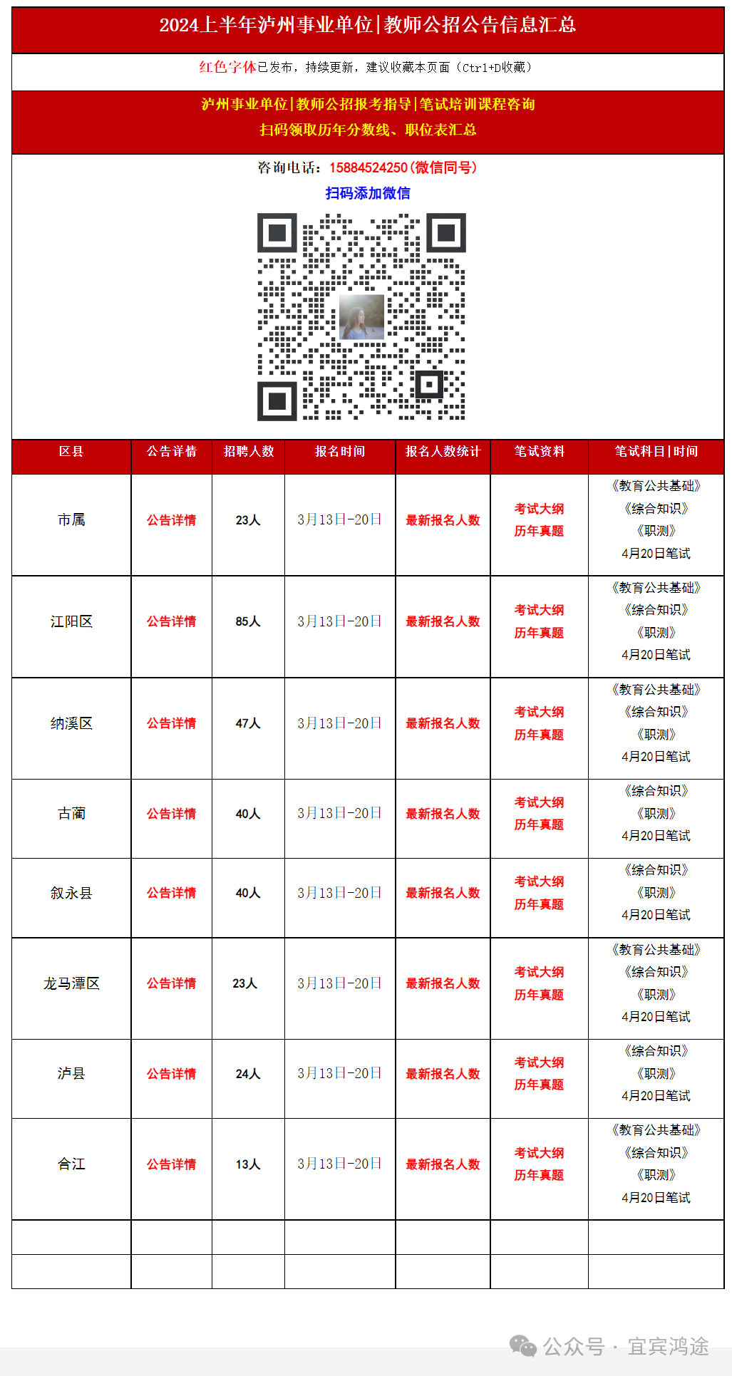 ★此页面为2024上半年泸州事业单位|教师公招招聘公告汇总页面,公告发布及时更新,以便参考,广大考生可以收藏此页面,随时关注!