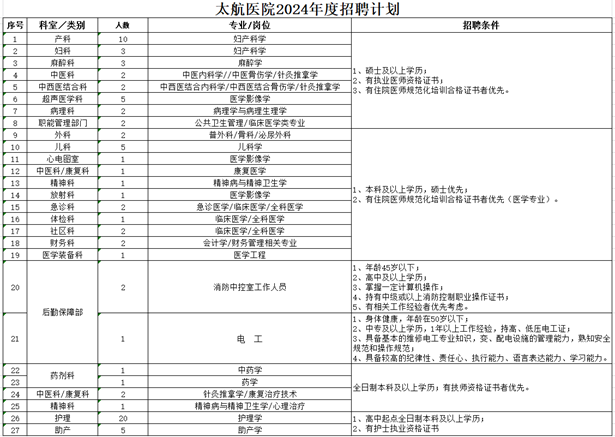 太原市太航医院成立于1986年,是一所学科特色突出、地域知名度高的集医疗、教学、科研、预防于一体的三级妇产专科医院,隶属于中国通用技术集团医疗健康有限公司。现因业务发展需要,按照公开、平等、竞争、择优的原则,面向社会公开招聘工作人员: