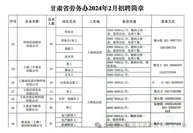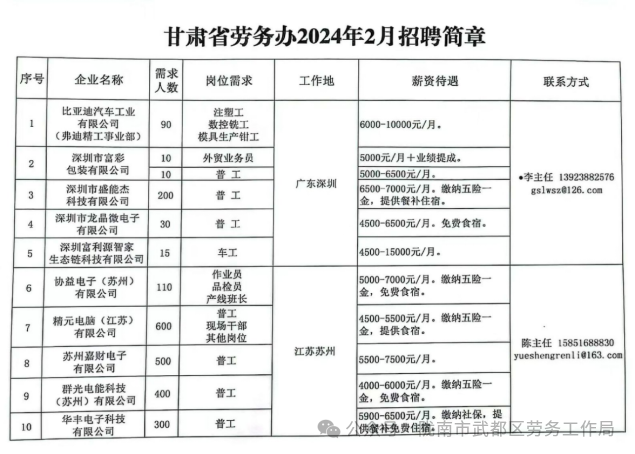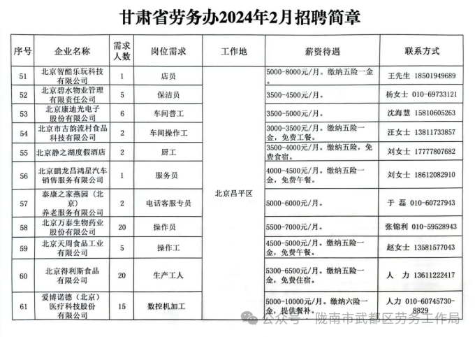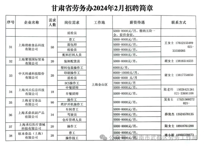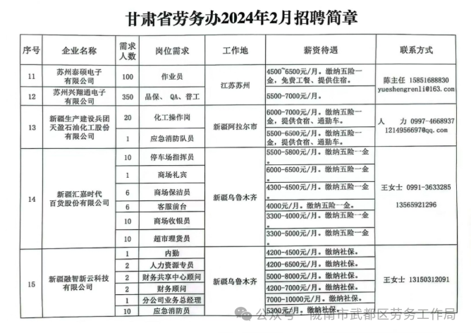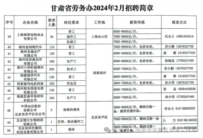 >武都区2024年“春风行动”就业招聘信息发布(第十期)