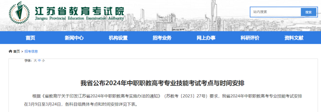 近日,江苏省教育考试院公布了2024年中职职教高考专业技能考试考点与时间安排。
