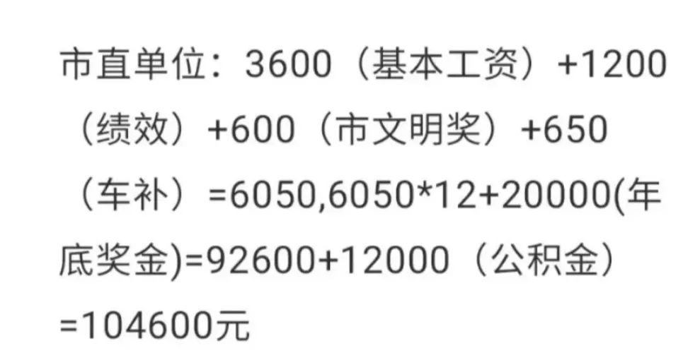 最近,有网友分享了他在许昌市直单位当公务员的工资待遇,引起了广泛关注。据这位网友透露,他的基本工资为3600元,加上绩效工资、市文明奖、车补等各项补贴,每月到手约有6050元。年底还有20000元的奖金,公积金一年12000元。这样算下来,每年的工资收入约为10万元左右。这样的收入水平在四线城市中已经算是比较可观的,足以应对一般的生活开销。