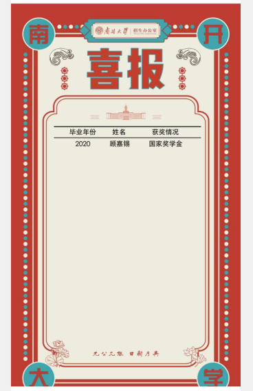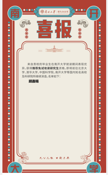 春华秋实,桃李盈香。近日南开大学向我校发来喜报:热烈祝贺我校毕业生顾嘉锡同学在南开大学就读期间表现优异,获得国家奖学金及推荐免试攻读研究生资格,即将前往北京大学、清华大学、中国科学院、南开大学等国内知名高校及科研院所继续深造。
