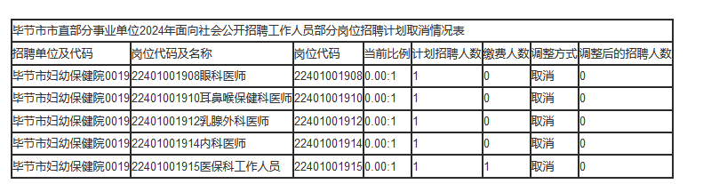 毕节市市直部分事业单位2024年面向社会公开招聘工作人员报名工作已结束。根据《毕节市市直部分事业单位2024年面向社会公开招聘工作人员简章》(以下简称《简章》)“网上缴费结束后,岗位缴费人数与招聘计划数达不到3:1比例的岗位,该岗位招聘计划予以减少或取消(不含浙江省人民医院毕节医院、毕节市第四人民医院和毕节市妇幼保健院招聘岗位中注明‘缴费人数与招聘计划数达不到3:1比例的,直接进入资格复审’的岗位)。岗位招聘计划减少或取消的情况在毕节市人民政府网或毕节市人力资源和社会保障局官网上公布。岗位招聘计划减少的,报考该岗位的考生所报岗位不再进行调整;岗位招聘计划取消的,办理退费手续”的规定,现将毕节市市直部分事业单位2024年面向社会公开招聘工作人员部分招聘计划岗位取消的情况进行公告。具体详见附件。