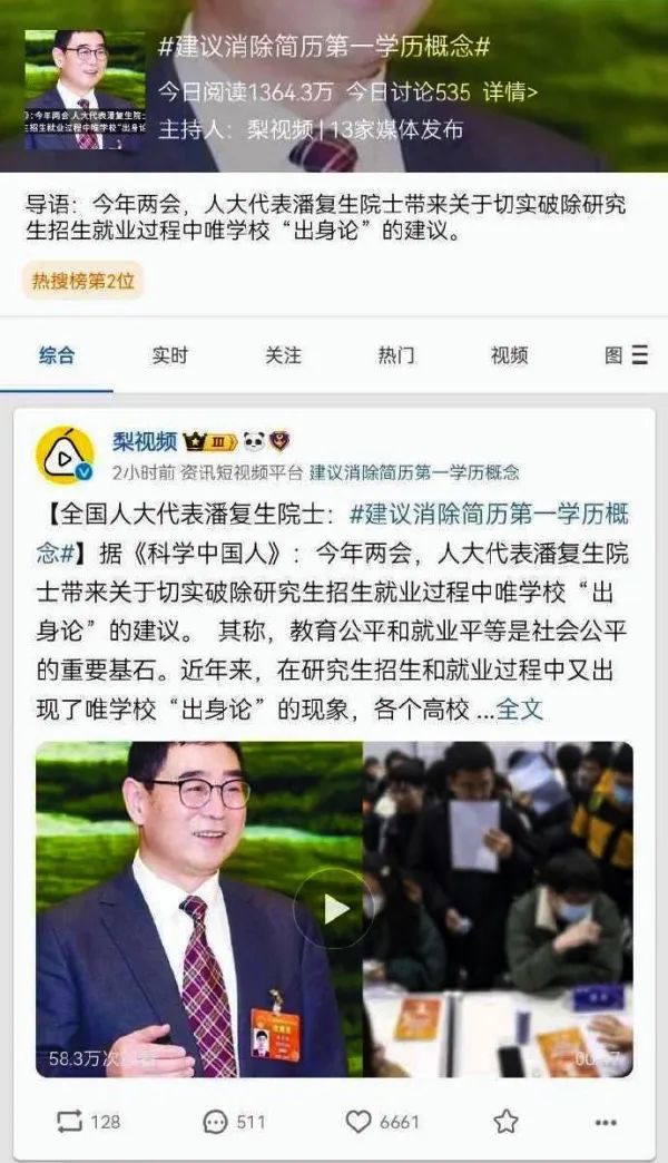 所以对于人大代表潘复生院士关于切实破除研究生招生就业过程中唯学校“出身论”的建议。只想说,建议是好建议,可是要想达成不仅很难,还可能带来秩序层面“毁灭性的灾难”。
