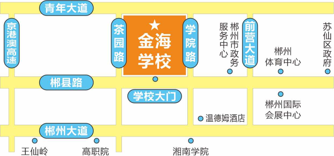 湖南省郴州市苏仙区金海学校是“全国十佳民办教育品牌”湖南长沙金海教育集团的成员学校之一,也是郴州市与苏仙区人民政府重点打造的民生工程项目。学校总投资3.5亿元人民币,用地128亩,建筑面积9万平方米,是一所十二年一贯制寄宿学校。