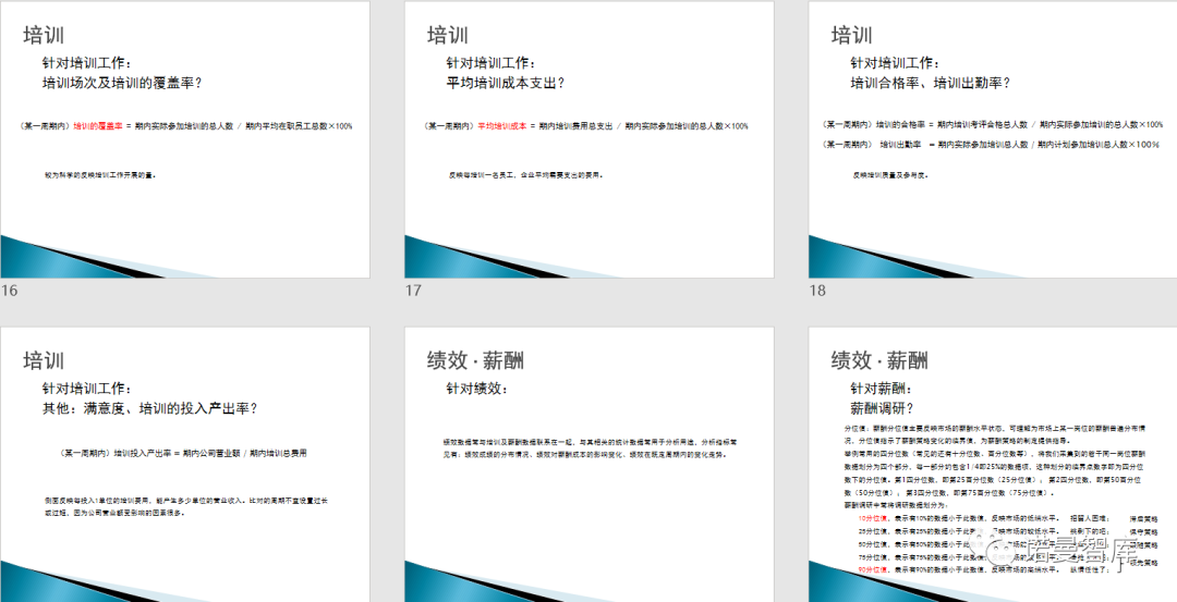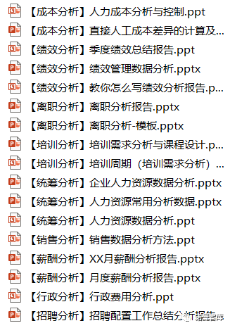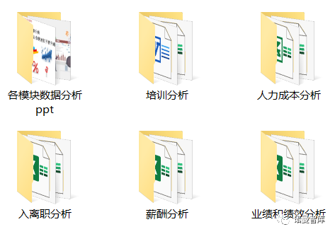 资料包含:各模块数据分析ppt、培训分析、入离职分析、人力成本分析、薪酬分析、绩效分析等Excel图表。