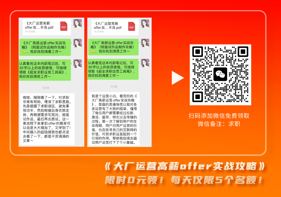 最后,我将近5年求职闭环系统迭代提炼的精华,整理成了一份内部笔记:《价值1999元,0-60w大厂高薪运营offer路径地图.pdf》(已更新到3.0)