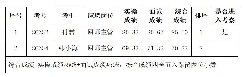 >关于厨师主管公开招聘考试综合成绩和拟进入考察人员名单的公示