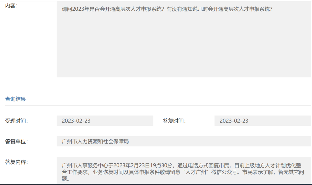 笔者去网上搜了下最新关于广州高层次人才的相关信息,最近一次的还是广州市人社局看到的信息,也是在2023年2月份有人询问广州高层次人才2023年还会不会开通认定,但是得到的答案也是模棱两可,不确定会不会取消,也不确定会不会重新开通。