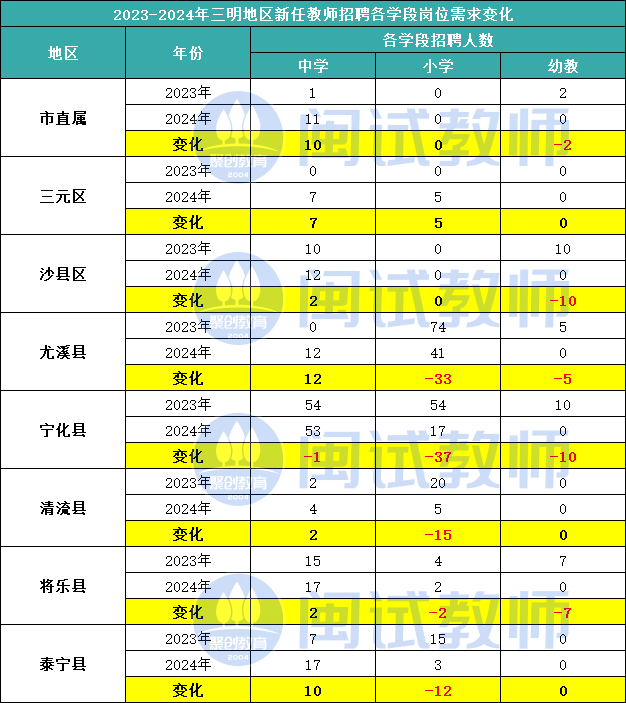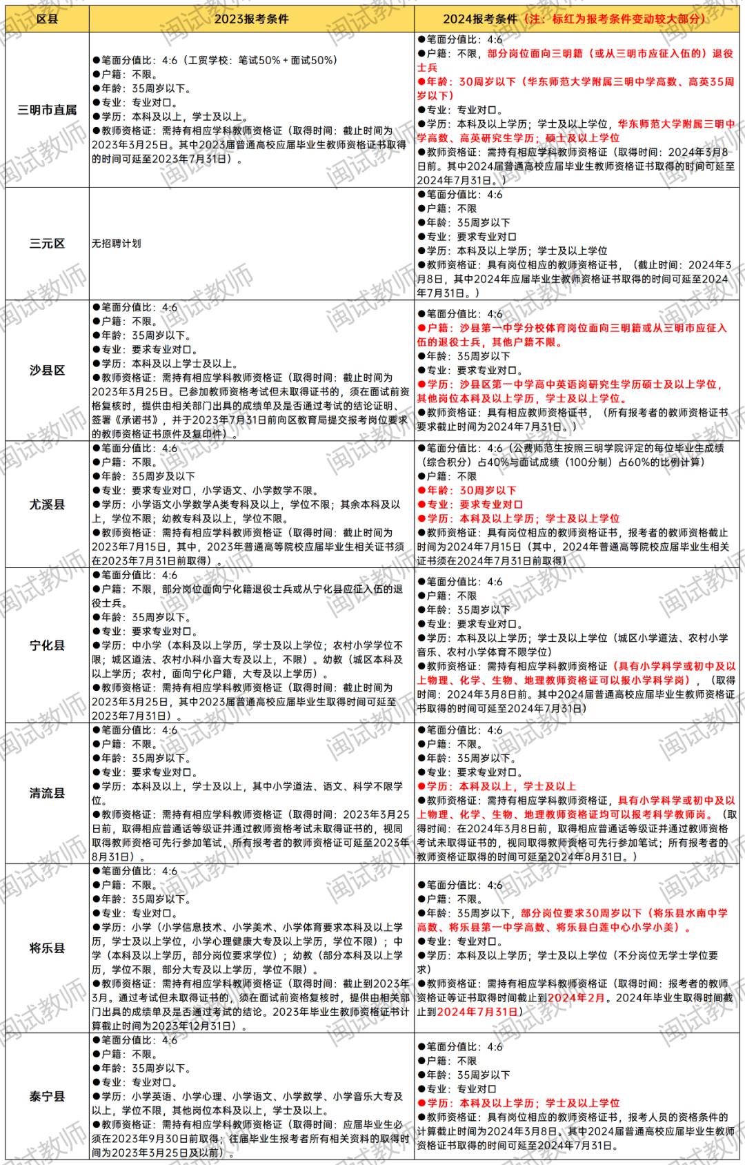 对比2023-2024年三明地区招聘条件,整体变动不是很大,部分地区的年龄|专业|学历要求有所提升,例如: