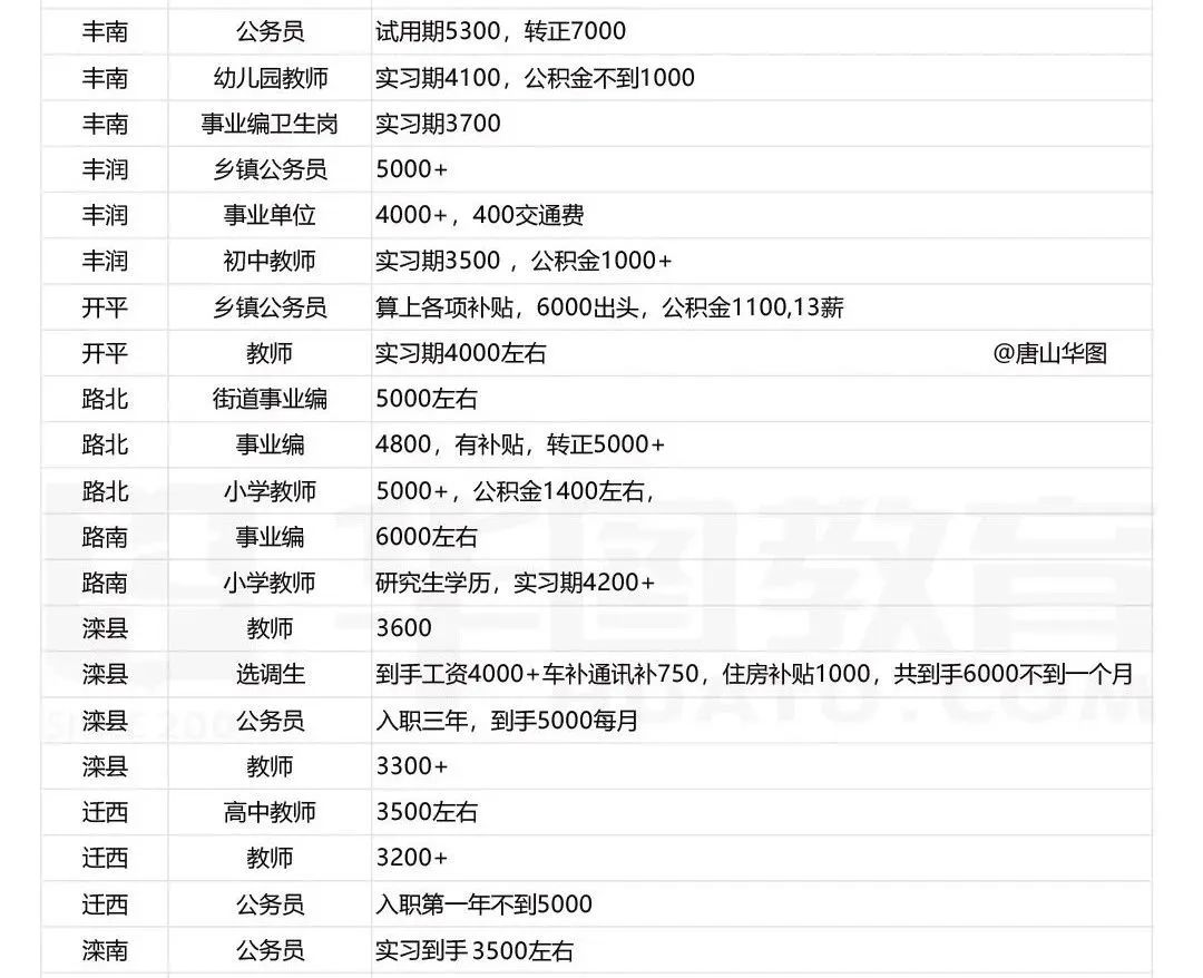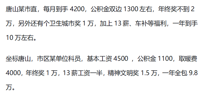 唐山某市直,每月到手4200,公积金双边1300左右,年终奖不到2万,另外还有个卫生城市奖1万,加上13薪、车补等福利,一年到手10万左右。