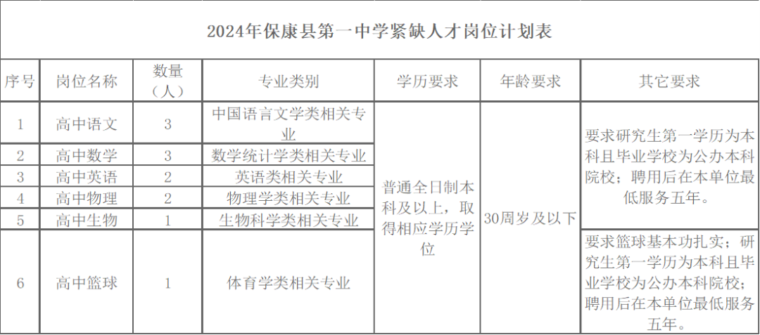 2024年,保康县第一中学拟招聘急需紧缺人才计划12人,有事业单位编制,热忱欢迎广大毕业生前来应聘,具体条件如下: