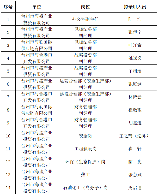 根据《台州市海洋投资发展集团有限公司关于公开招聘17名一级子公司高层次紧缺人才的公告(2023.12.22)》及《台州市海洋投资发展集团有限公司关于公开招聘事项的补充公告(2024.1.12)》有关要求,经考生报名、资格审查、面试、体检和考察环节,经研究,确定以下14名人员为拟录用对象,现公示如下: