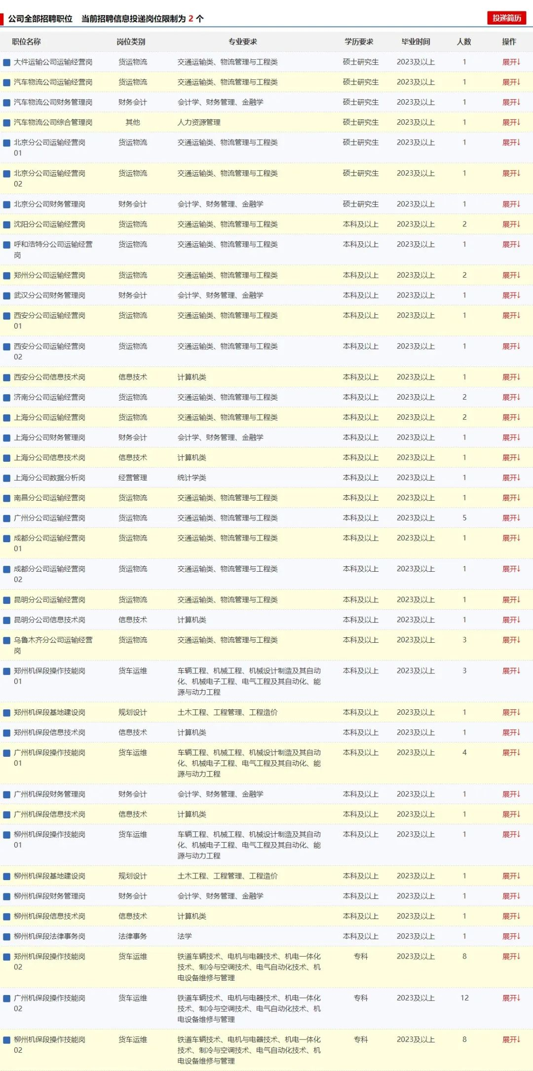 中铁特货物流股份有限公司2024年度招聘毕业生公告中铁特货物流股份有限公司根据企业发展需要,拟招聘普通高等院校毕业生,具体事宜公告如下:本次计划招聘毕业生80名,招聘岗位和专业、学历要求详见下表。列入国家招生计划、在校期间为非在职的2024年应届普通高等院校研究生、全日制本科和专科(高职)毕业生,以及经国家教育部留学服务中心学历认证的留学人员。毕业生须在2024年7月31日之前毕业,报到时取得国家认可的毕业证和学位证。其中:对毕业后户口、档案、组织关系仍保留在原毕业学校,或保留在各级毕业生就业主管部门(毕业生就业指导服务中心)、各级人才交流服务机构和各级公共就业服务机构,且至今未与其他单位建立劳动关系的2023年高校毕业生,可以按照2024年应届毕业生身份参加应聘。2.品行端正,遵纪守法,思想政治素质优良,热爱铁路特货事业。3.身心健康,具有正常履行岗位职责的身体条件,其中,操作技能岗位无色盲色弱。具有良好的团队协作意识,服从公司对岗位的安排和调整,素质能力适应公司工作岗位要求。5.专科(高职)毕业生在校期间所学专业为铁路相关方向,所学主要课程为铁路主专业课程。1.网上报名。应聘者请登录“中国铁路人才招聘网”(http:/rczp.china-railway.com.cn)(首次登录需先进行注册)进行报名。应聘者须据实填报本人信息,按照要求上传本人身份证、教育部学籍在线验证报告(或教育部学历证书电子注册备案表)、毕业生就业推荐表、成绩单等证明材料扫描件,报名截止日期为2024年3月15日。请认真阅读岗位条件、根据本人所学专业、意向岗位对口报考,每人限报两个岗位。⒉.简历筛选。根据报名情况,在符合条件的人员中择优确定笔试、面试人选,并通过电话、短信、邮件等形式通知,未入围者恕不通知。3.考试考核。接到通知的应聘者须按指定时间、地点参加考试,否则将视为主动放弃。招聘笔试、面试考核在2024年5月31日前完成,具体时间、地点另行通知。参加考试考核时应携带以下材料并进行现场确认:(1)国内高校毕业生:①中国铁路人才招聘网打印的《毕业生应聘登记表》(需本人签字);②毕业生就业推荐表(须学校盖章);③学习成绩单(须学校盖章);④教育部学籍在线验证报告(或教育部学历证书电子注册备案表);⑤英语四、六级成绩单;⑥本人身份证、户口簿首页及本人页复印件;⑦其他资格证书、获奖证书等证明本人资历能力的材料;⑧近半年内二级甲等及以上医院健康体检报告(血压、辨色力、视力、听力、心电图、胸片、血常规、尿常规、肝功能、肾功能为必检项目,报告必须有检查结论)。(2)国外高校毕业生:①中国铁路人才招聘网打印的《毕业生应聘登记表》(需本人签字);②教育部留学服务中心出具的《国外学历学位认证书》及国外院校学位证书(复印件及翻译件,在读学生请提供学校出具的在读证明并附中文翻译件)③国外院校录取材料;④学习成绩单(附中文版);⑤近半年内二级甲等及以上医院健康体检报告(血压、辨色力、视力、听力、心电图、胸片、血常规、尿常规、肝功能、肾功能为必检项目,报告必须有检查结论)。4.结果公示。拟录用人员名单将在中国铁路人才招聘网公示。1.应聘人员应承诺有关报名信息和所提交应聘材料的真实、准确和完整。一经发现弄虚作假、作弊行为,以及其他违反招聘规定的,立即取消应聘资格。2.应聘者在招聘期间应留意并保证联系电话、邮箱正常使用,避免消息遗漏。3.中铁特货公司不委托任何第三方招聘,也不在招聘过程中向应聘者收取任何费用,请提高警惕,谨防受骗。4.中铁特货公司保留对招聘公告及相关规定的最终解释权。咨询时间:工作日9:00-11:00、14:30-17:00