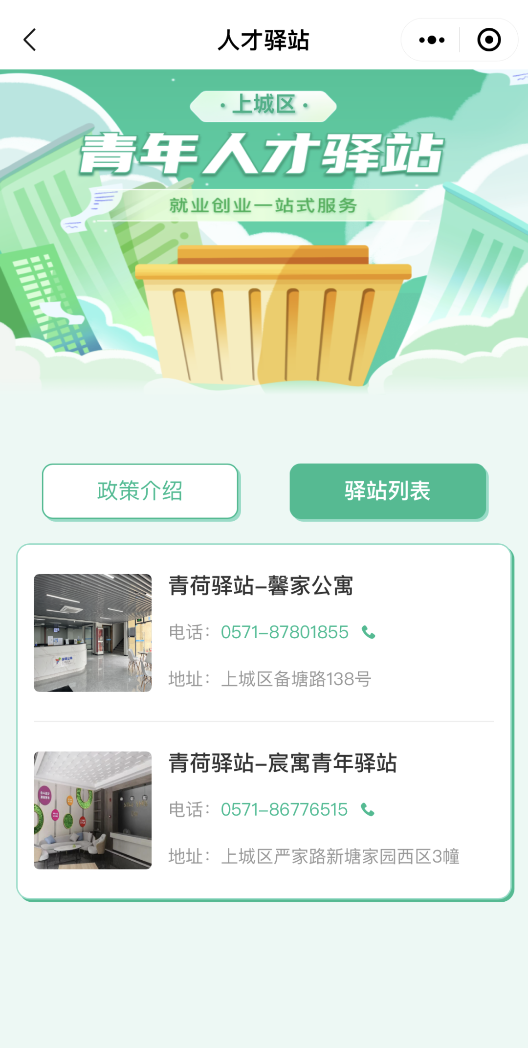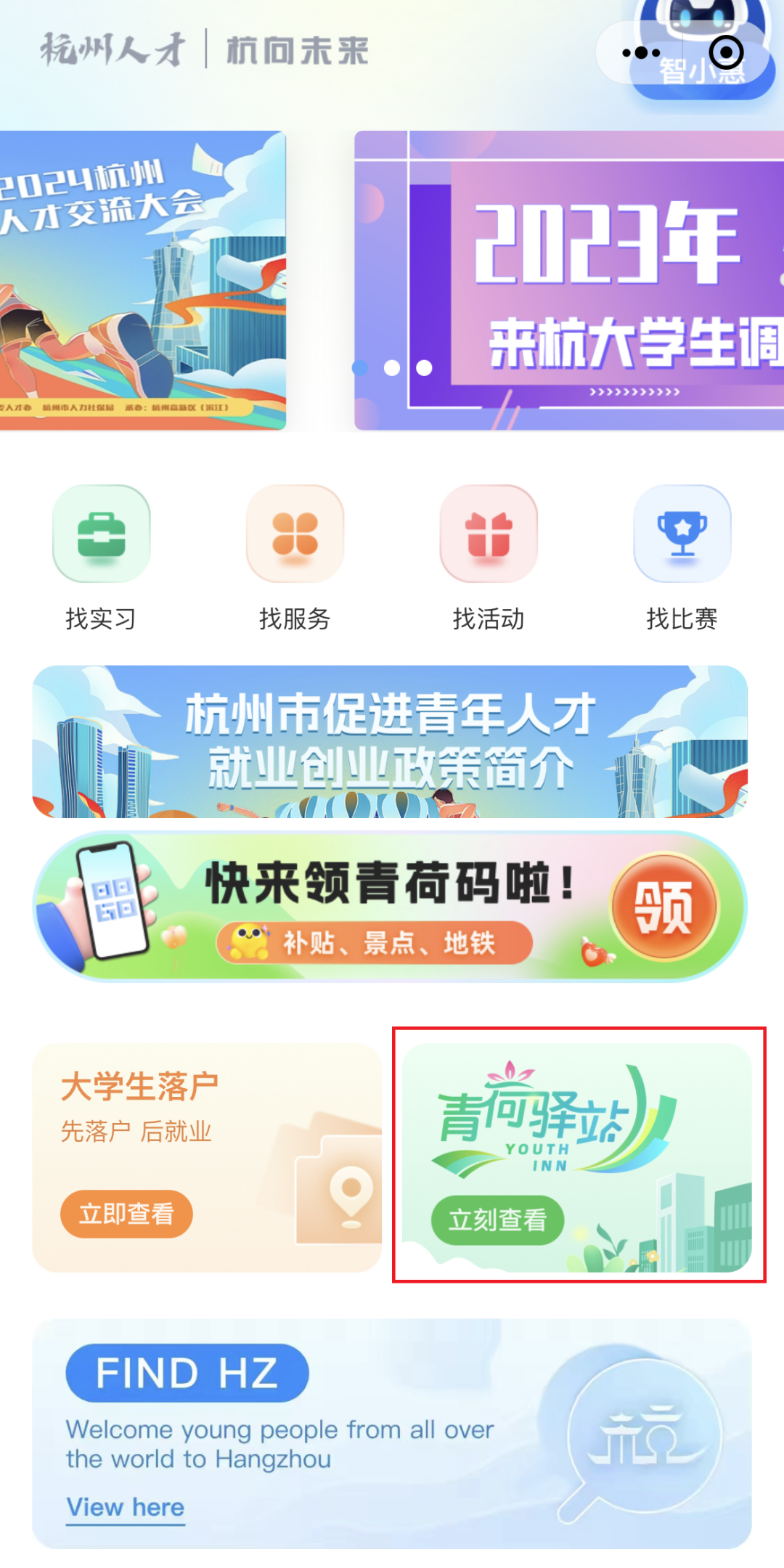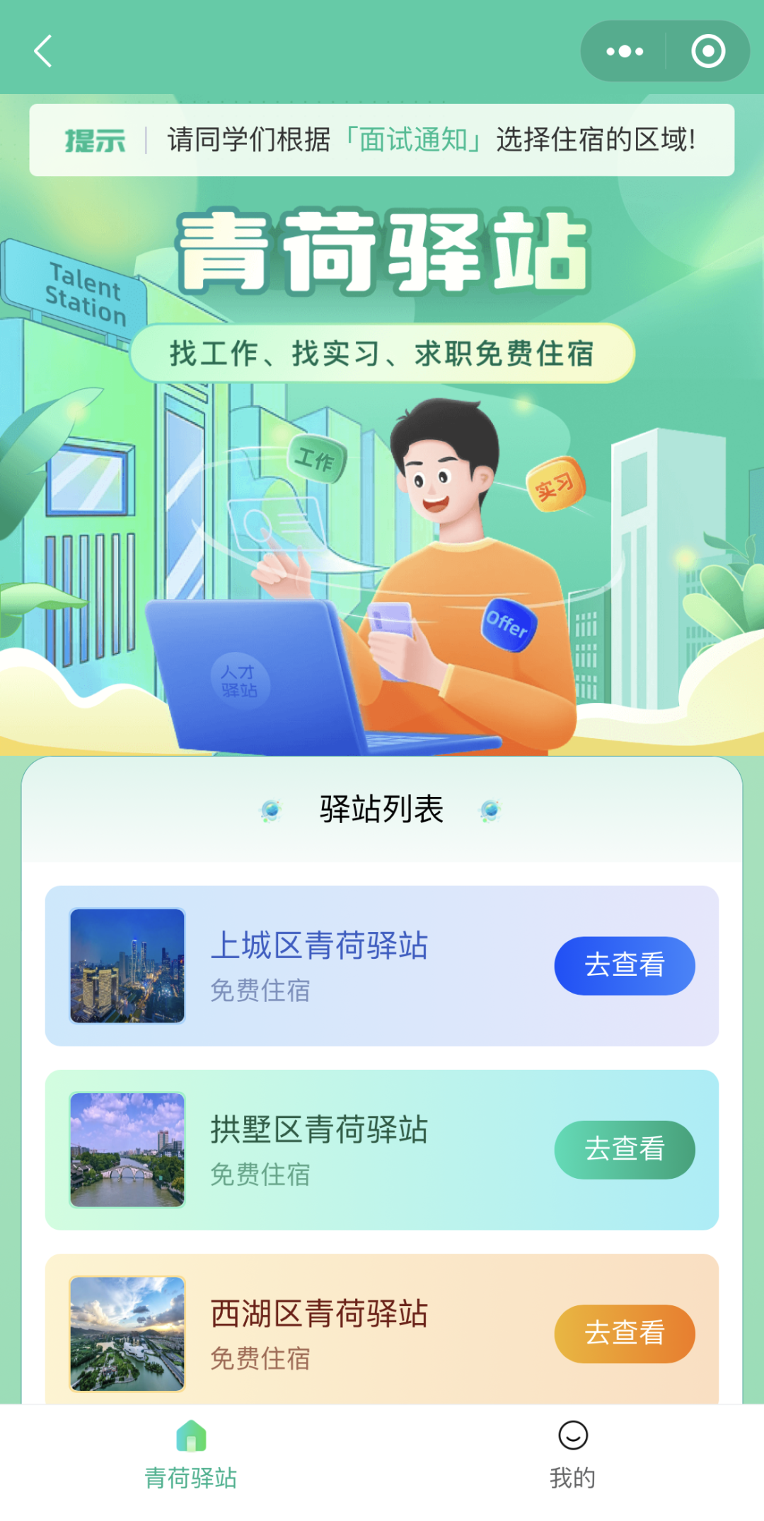 如何申请“青荷驿站”?只需在微信小程序搜索“人才杭州”,就能找到“青荷驿站”模块,实名认证登录后选择自己所对应的城区。