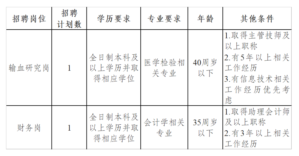 重庆市血液中心为适应采供血业务快速发展需要,进一步加强人才队伍建设,优化人才梯队结构,提高采供血服务水平,经中心研究决定,现计划面向社会招聘非在编输血研究工作人员1名,财务工作人员1名。