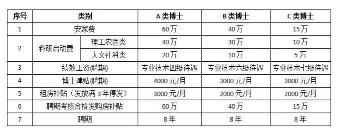 引进博士须签订聘用服务期协议,服务期不少于8年,按照聘用服务期协议享受下表待遇。